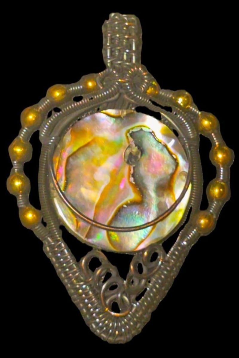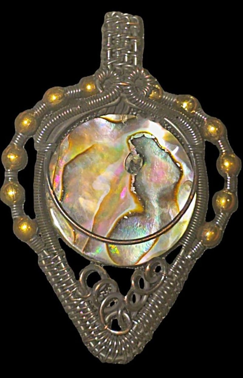 71.6 CARATS OPALISED SHELL AND WIRE WRAPPED PENDANT.