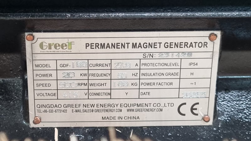 New In Box Permanent Magnet Generator, GreeF, Power 20kw, Frequency 50HZ, 415V, IP54 Protection Rating Model: GDF-180, Serial: 231428