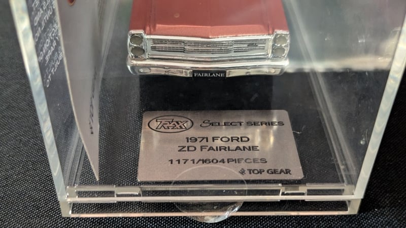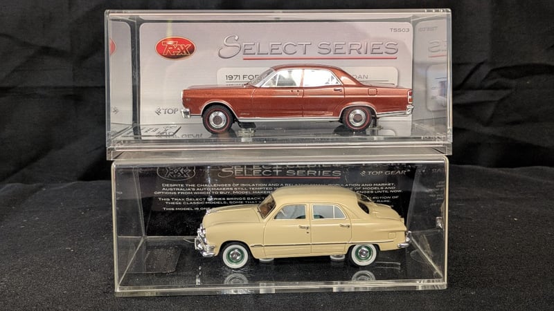 Trax SELECT SERIES Die Cast Model Cars including TSS08 1950 Ford Custom Sedan 'Single Spinner' #1254/1490 and TSS03 1971 Ford XD Fairlaine 500 Sedan #1171/1604