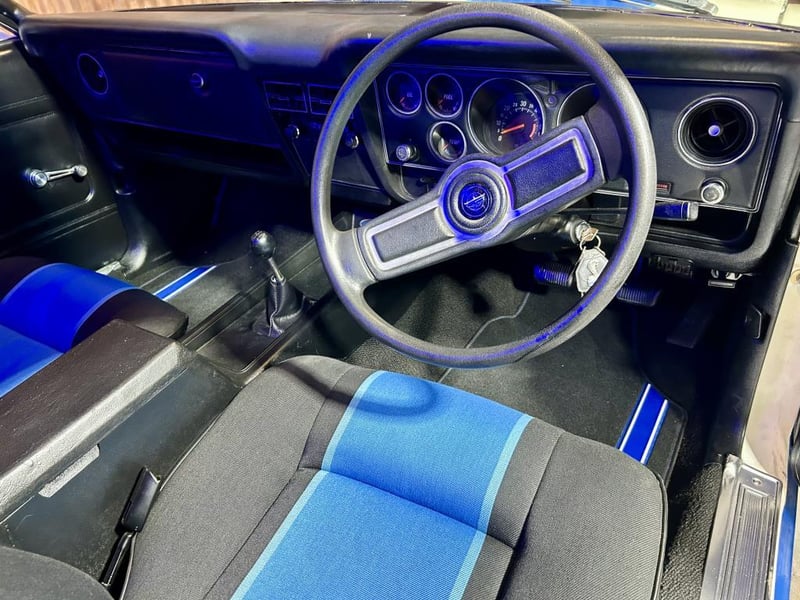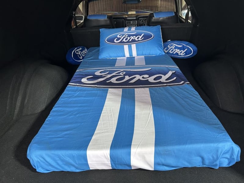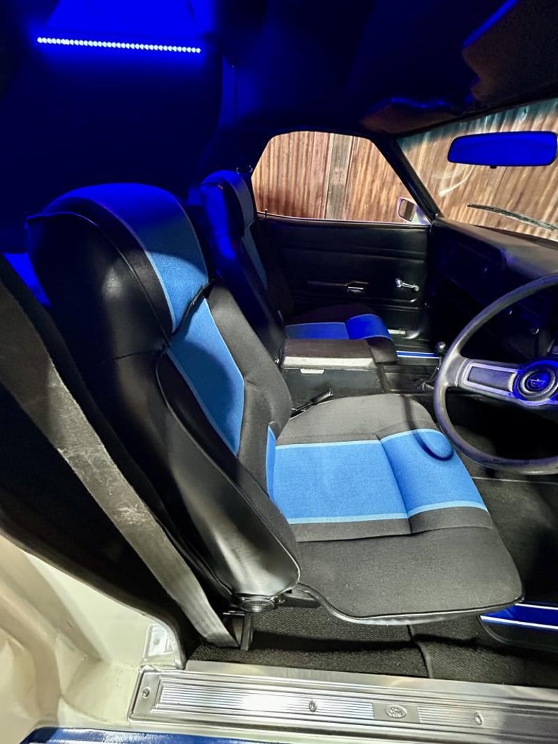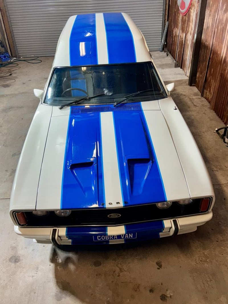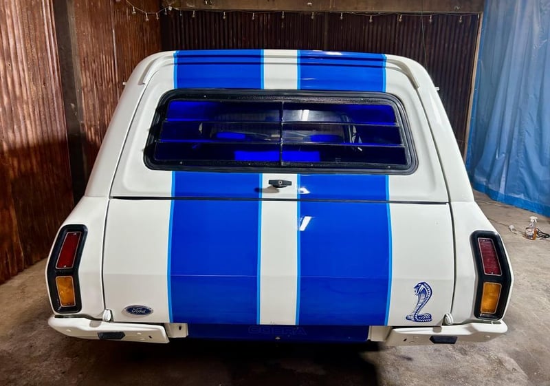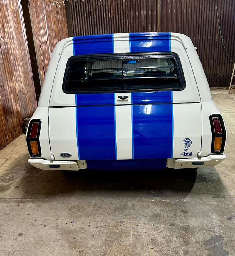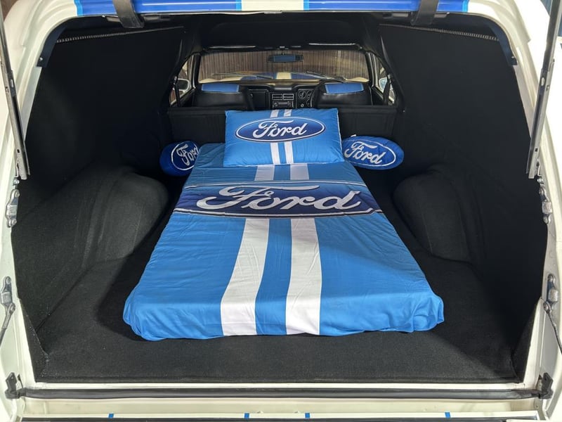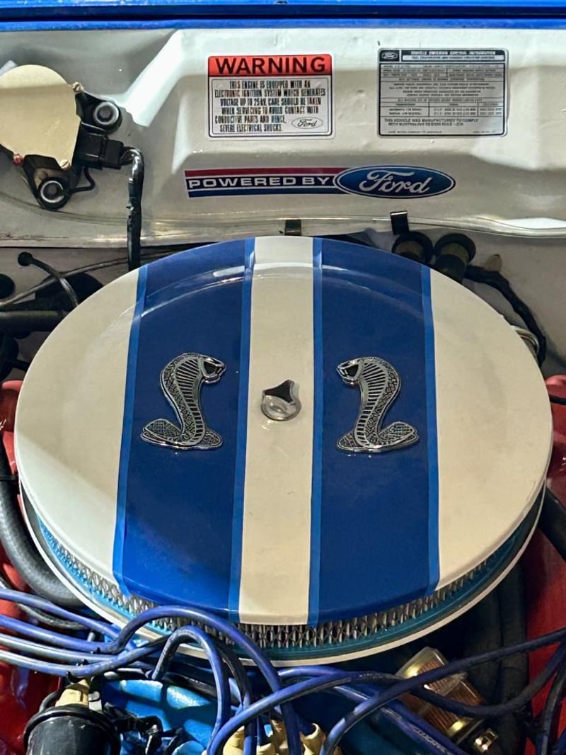 This example has undergone a complete restoration, including fresh exterior paint, Gravitex coating to the undercarriage, and a fully retrimmed interior. The cabin and cargo area feature new carpets, restored wall panels, a full-length hoodlining, correct Cobra-style seat trims, blue LED mood lighting, and a Ford-themed mattress — true to the era’s “rockin’ van” spirit. The engine bay is finished with a fully restored carburettor and custom Cobra-themed air cleaner, while exterior details include a restored GS grille, refurbished wiper motor, Bathurst Globe wheels with red-wall tyres, and a rare NOS Cheater rear louvre completing the look.
