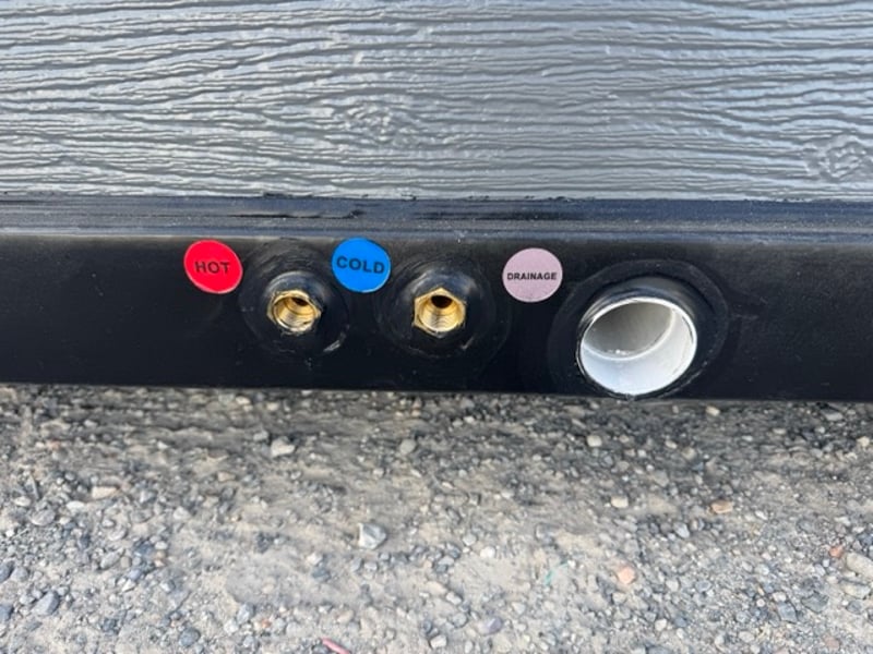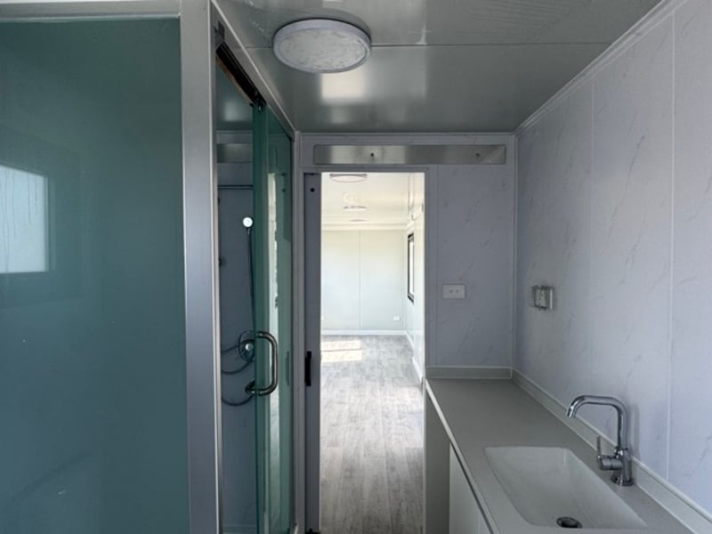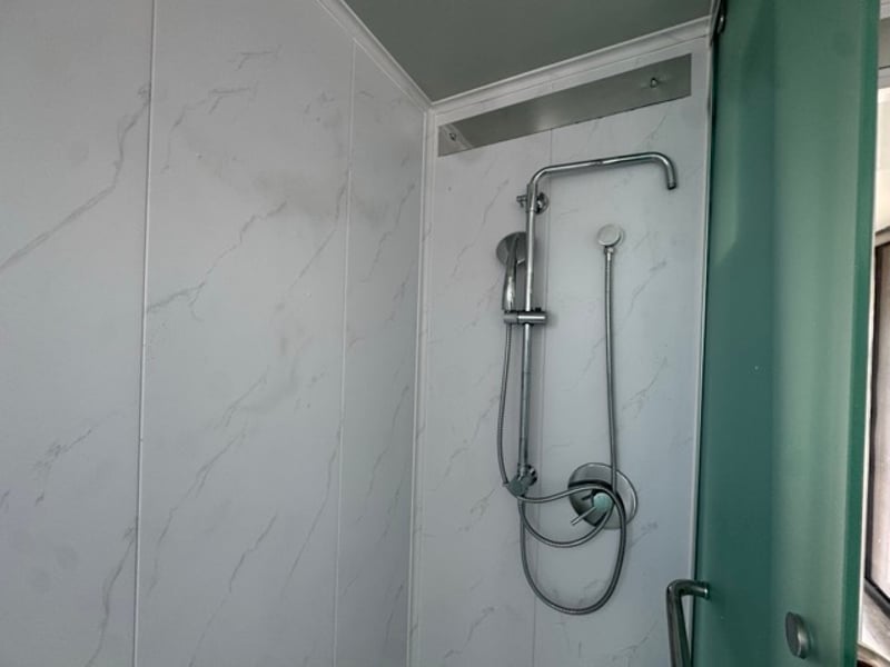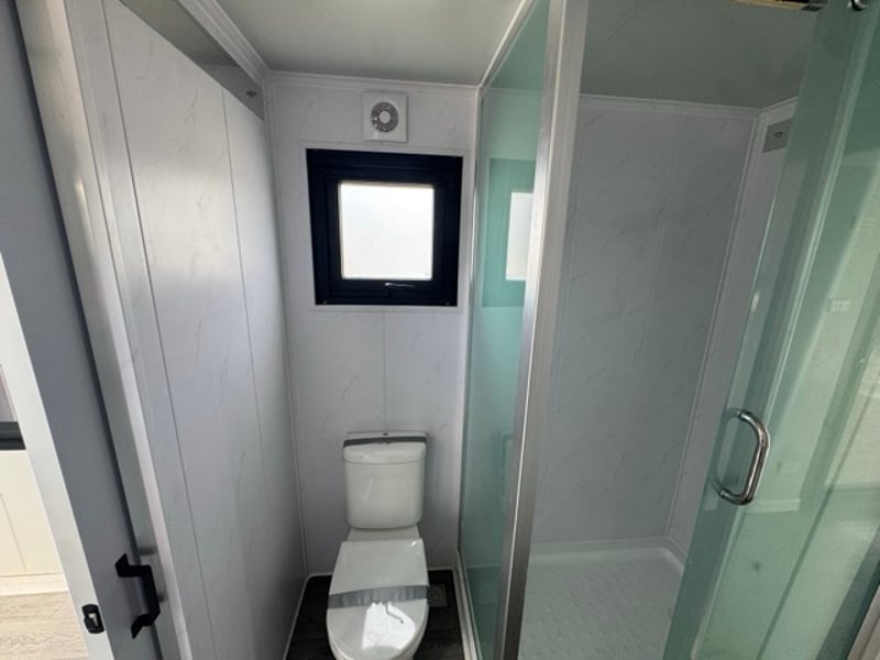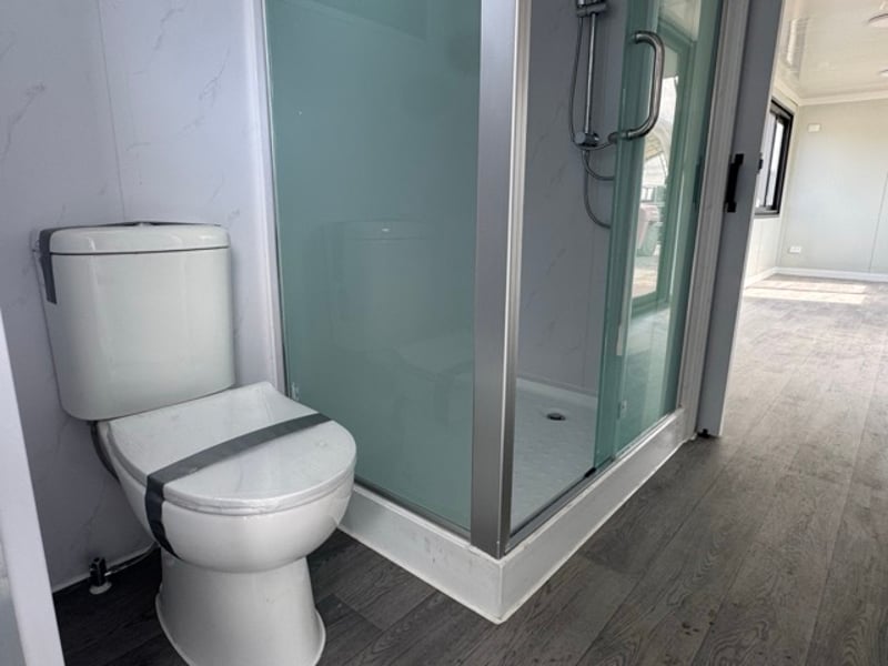 fittings, complete bathroom all connected, large shower area, vanity, toilet,
