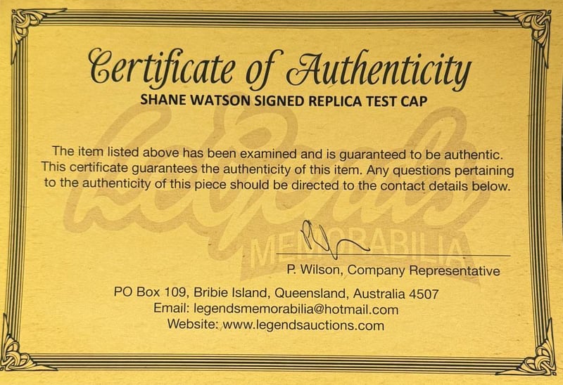 SHANE WATSON SIGNED AUSTRALIA REPLICA TEST CAP An Australian Replica Test Cap Personally Signed By Shane Watson. Shane Watson Is An Australian Cricket Coach, Commentator And Former Cricketer Who Played For And Occasionally Captained The Australian National Cricket Team Between 2002 And 2016. The Item Is Accompanied By A Certificate Of Authenticity.Condition: Good - Refer To Images585460+13
