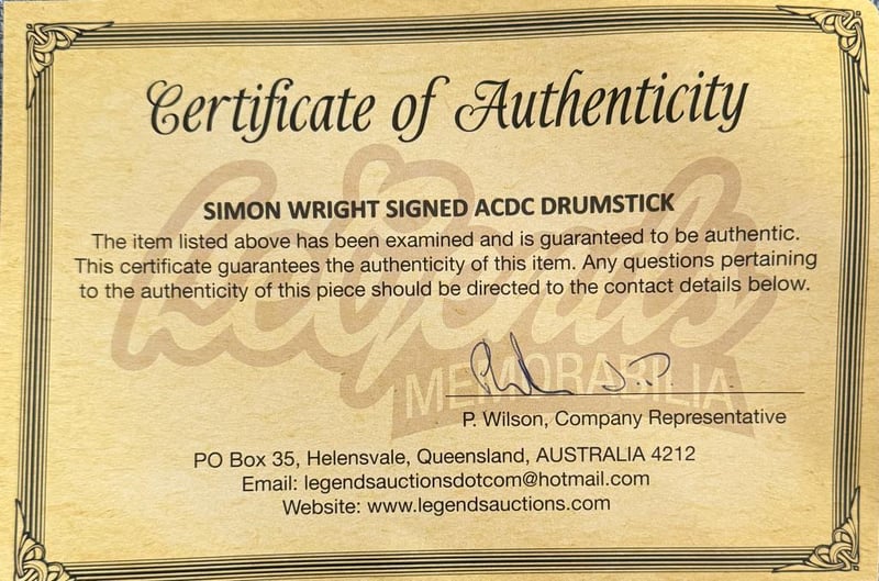 Simon Wright Personally Signed Ac/Dc Drumstick. Simon Wright Is An English Drummer Best Known For His Work With Rock Bands Ac/Dc And Dio. The Item Is Accompanied By A Certificate Of Authenticity.