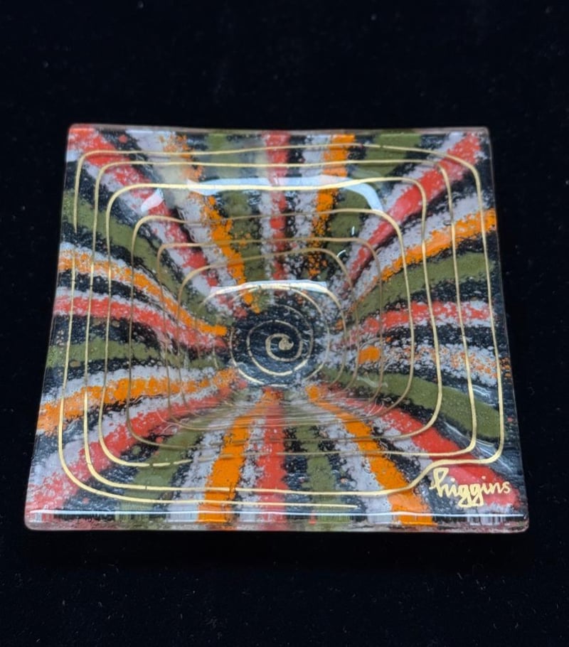 Transparent, Orange, Red, Green, Gold Spiral, Makers Signature Bottom Right