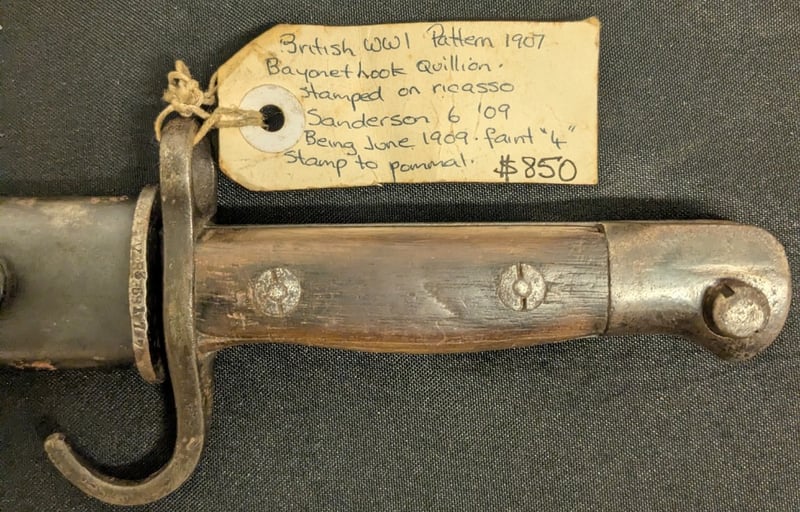 1907 BRITISH WWI PATTERN BAYONET HOOK QUILLION WITH LEATHER AND METAL SCABBARDItem Size: Height: 4cm, Width: 9cm, Depth: 58cm, Weight: 2KgCondition: Good - Refer To ImagesACACIA RIDGE585075+5