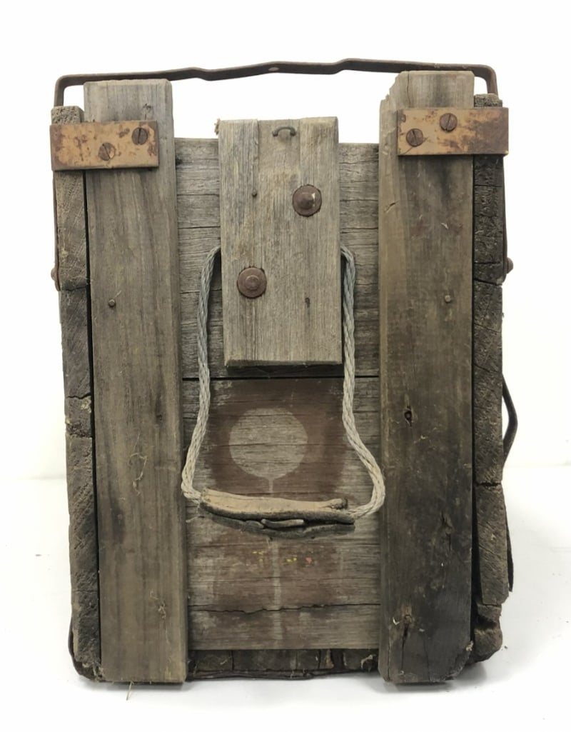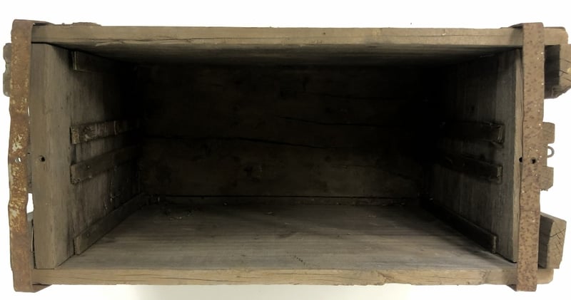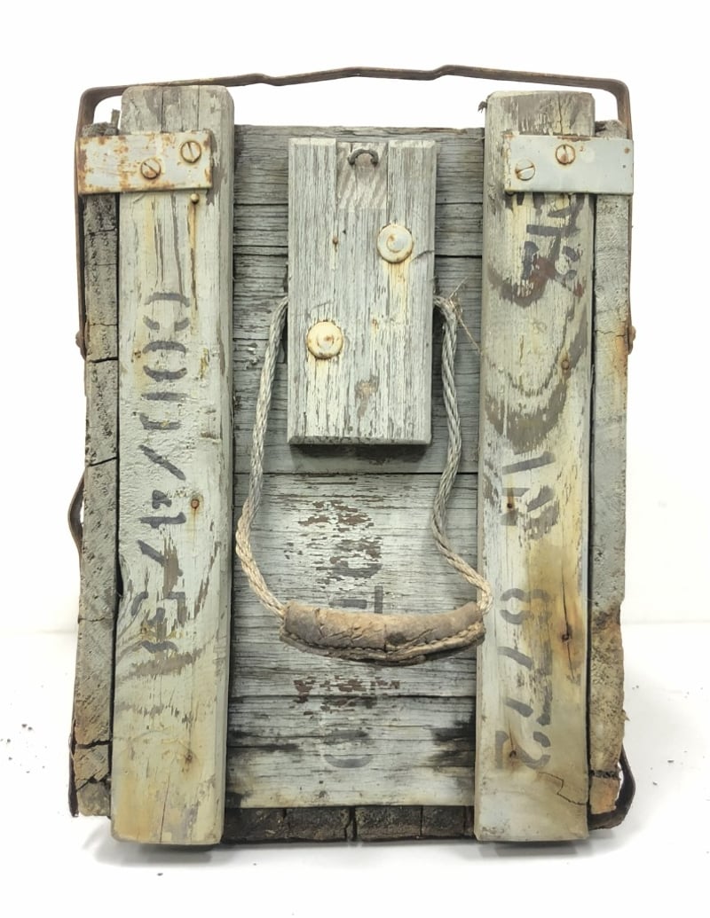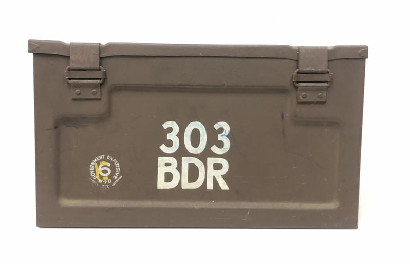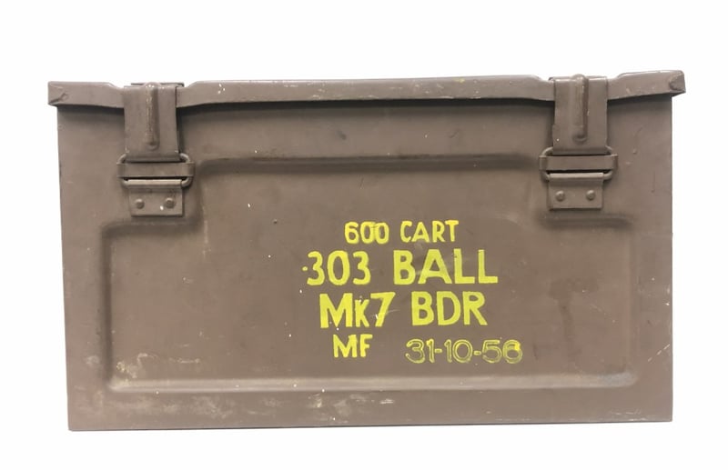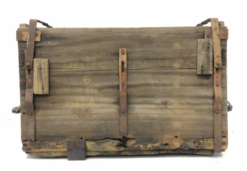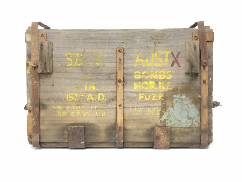 Designed To Hold 600 Rounds Of .303 Ball Mk7 Ammunition. Constructed From Metal With Hinged Carry Handles And Locking Clasps. Features Yellow Stencil Markings Detailing The Ammunition Type, Quantity, And Manufacturing Batch (E.G., Mf 31-10-50). Originally Used By Military Forces, These Are Now Common Collectibles Used For Tool Storage Or Home Decor. Military Wooden Ammunition Crate, Specifically Identified As A Transit Chest For "Bombs" Or Mortars, Such As The No. 76 Grenade Or 3-Inch Mortar.