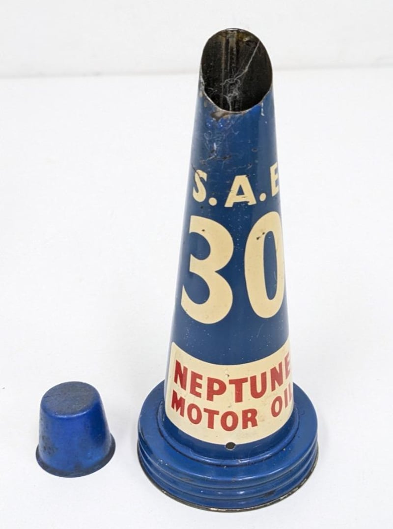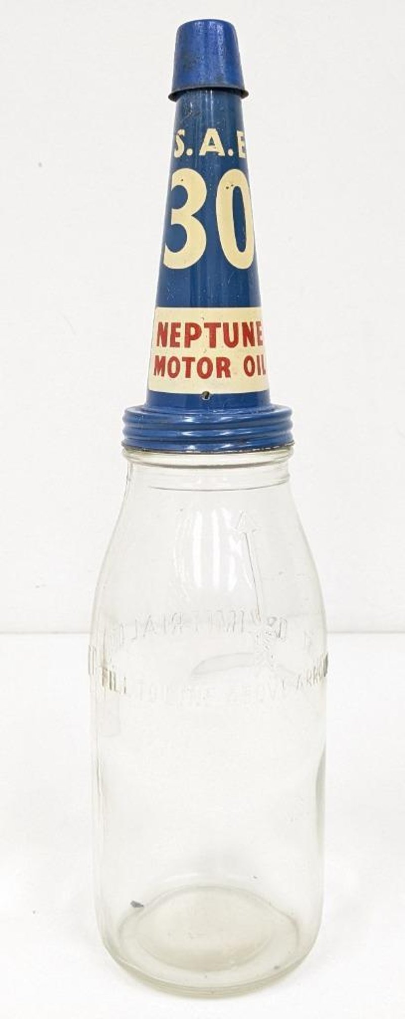 NEPTUNE MOTOR OIL GLASS BOTTLE, WITH SAE 30 TIN OIL POURERItem Size: Height: 90cm, Width: 9cm, Depth: 1cm, Weight: 1KgCondition: Good - Refer To ImagesFC1B163092+10