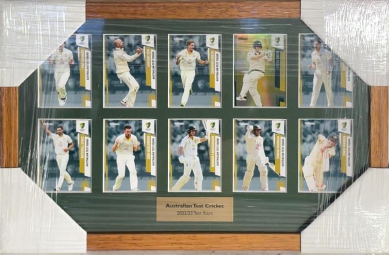 AUSTRALIAN TEST CRICKET 2022/23 TEST STARS FRAMED DISPLAY Includes Ten Individual Player Cards Displayed Against A Green Background With Engraved Plaque. Condition: Good - Refer To Images SR 233094+2