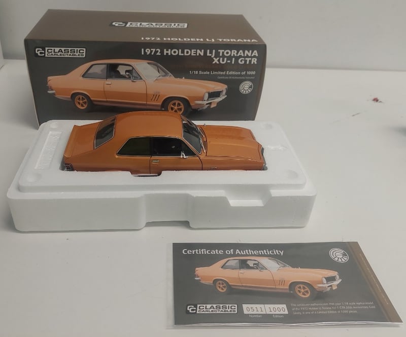 CLASSIC CARLECTABLES 1972 HOLDEN LJ TORANA XU-1 GTR 50TH ANNIVERSARY GOLD LIVERY MODEL CAR 1:18 SCALE.