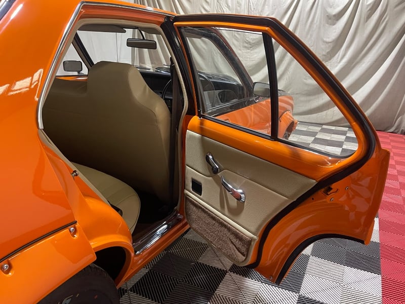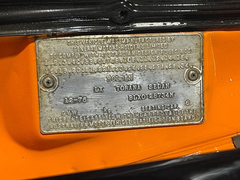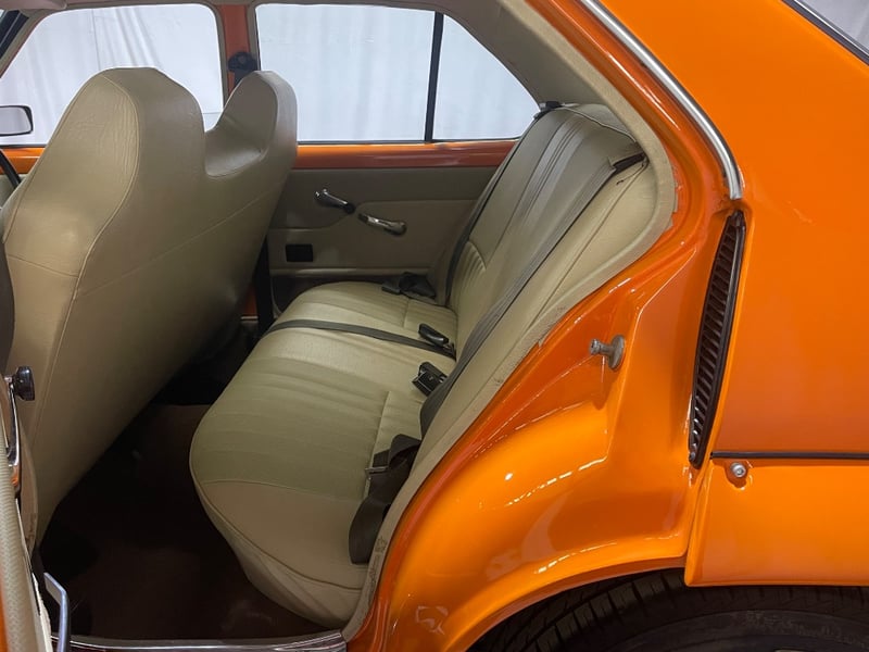 1976 Holden LX Torana four‑door sedan finished in Orange. Rear‑wheel drive configuration powered by a 253ci (4.1‑litre) V8 petrol engine paired with a 4‑speed automatic transmission. Odometer indicating 236,386 kilometres. Seating for five occupants.