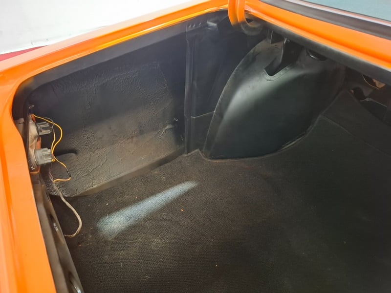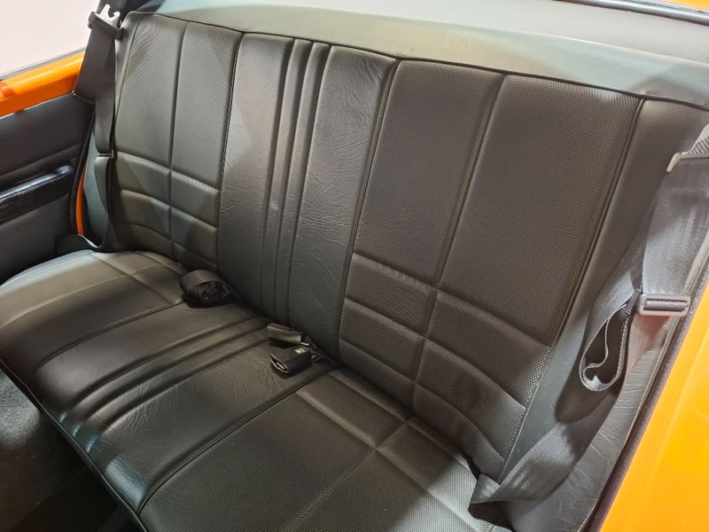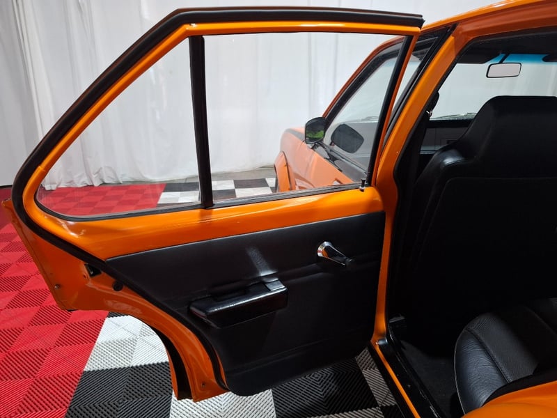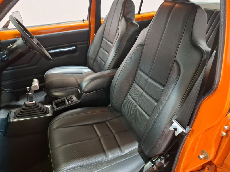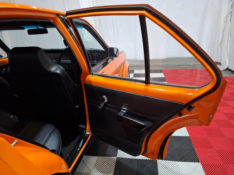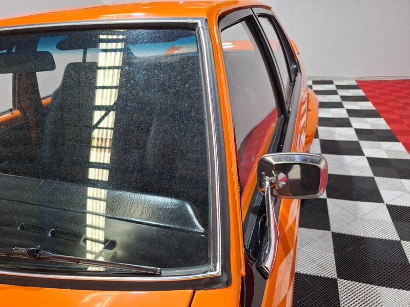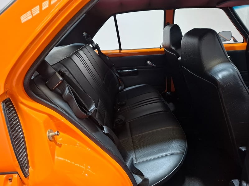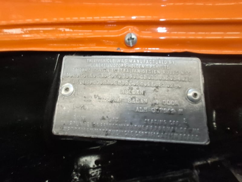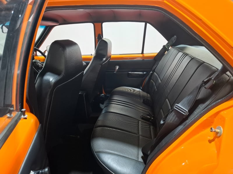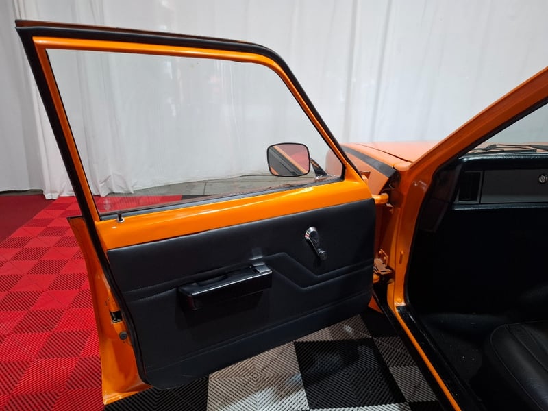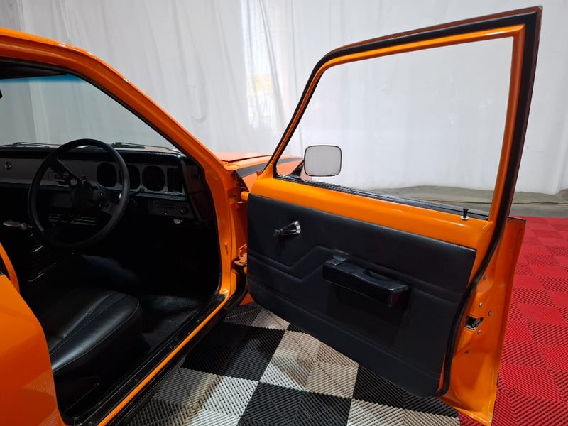1974 Holden LH Torana SLR 5000 four‑door sedan finished in Orange. Rear‑wheel drive configuration powered by a 5.7‑litre V8 petrol engine paired with a 3‑speed automatic transmission. Odometer indicating 12,341 kilometres. Seating for five occupants.