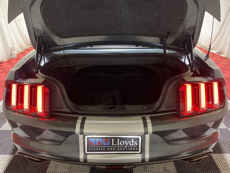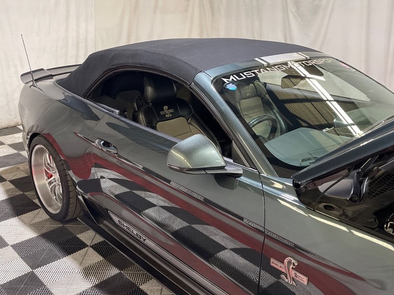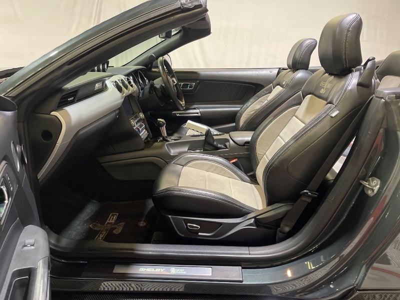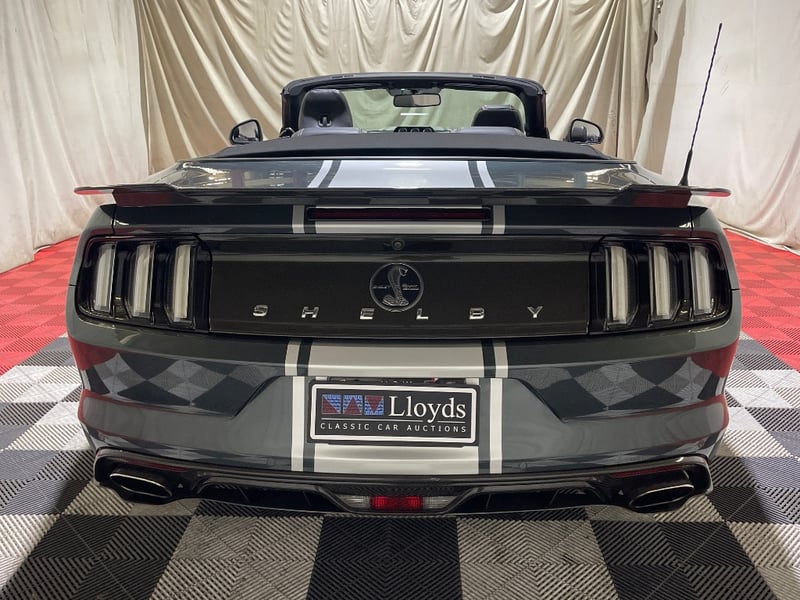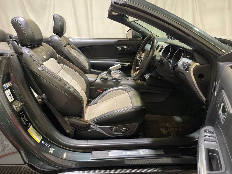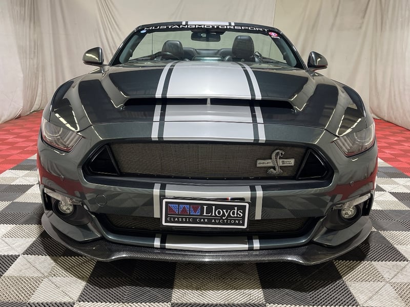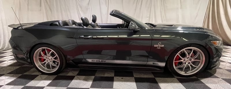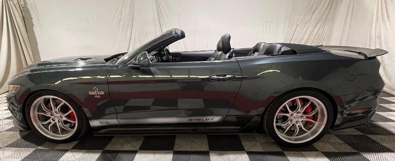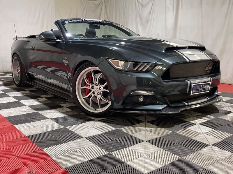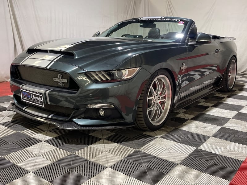 2016 Shelby Mustang Super Snake two‑door convertible finished in Green. Rear‑wheel drive configuration powered by a supercharged 5.0‑litre V8 petrol engine paired with an automatic transmission. Odometer indicating 39,610 kilometres. Seating for four occupants.