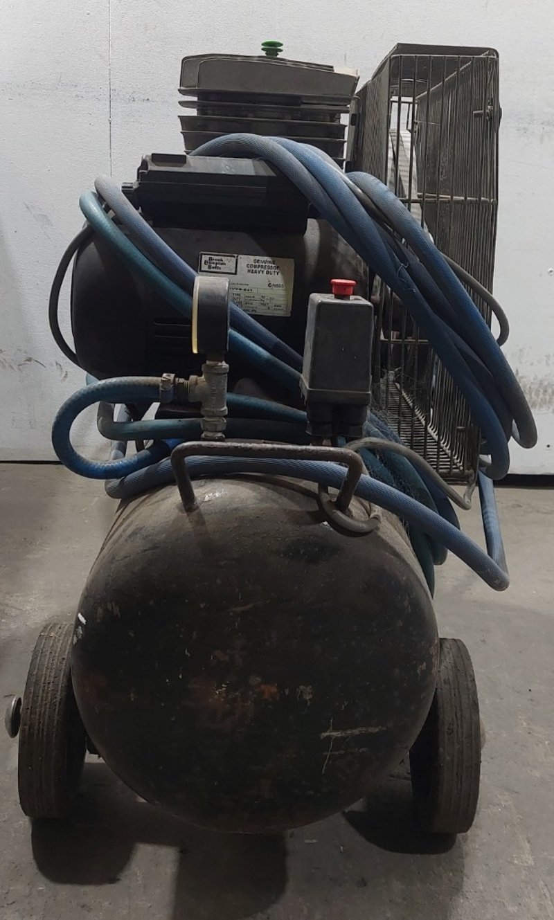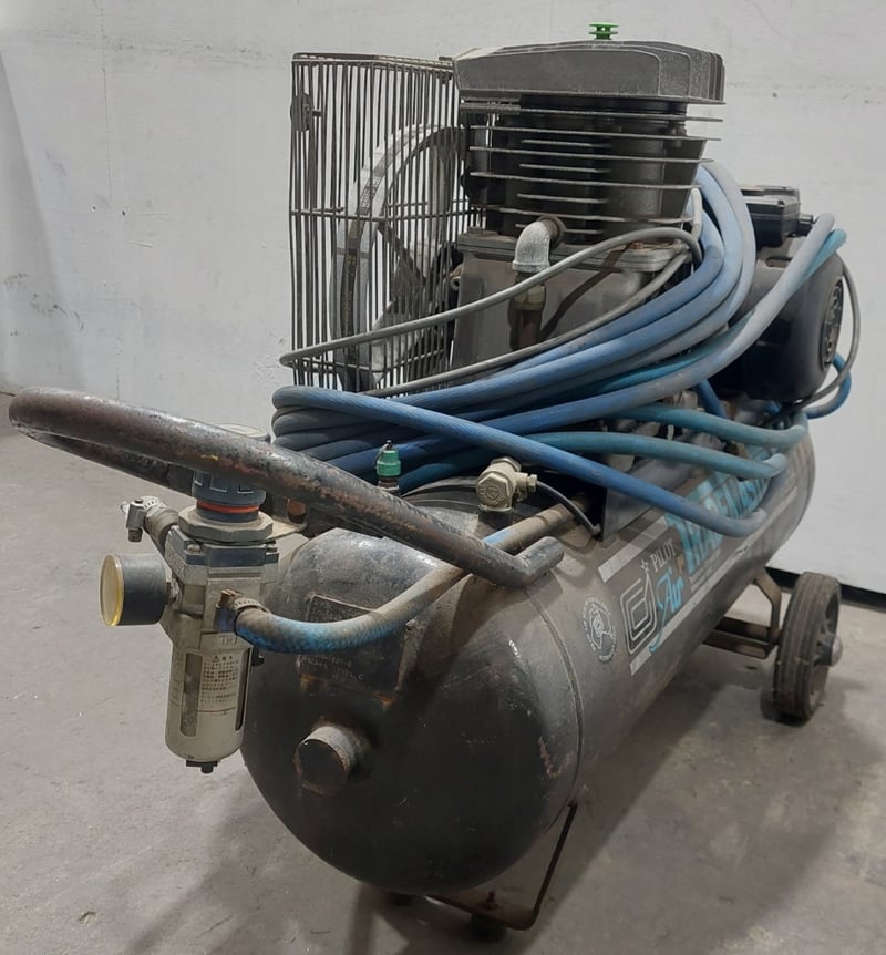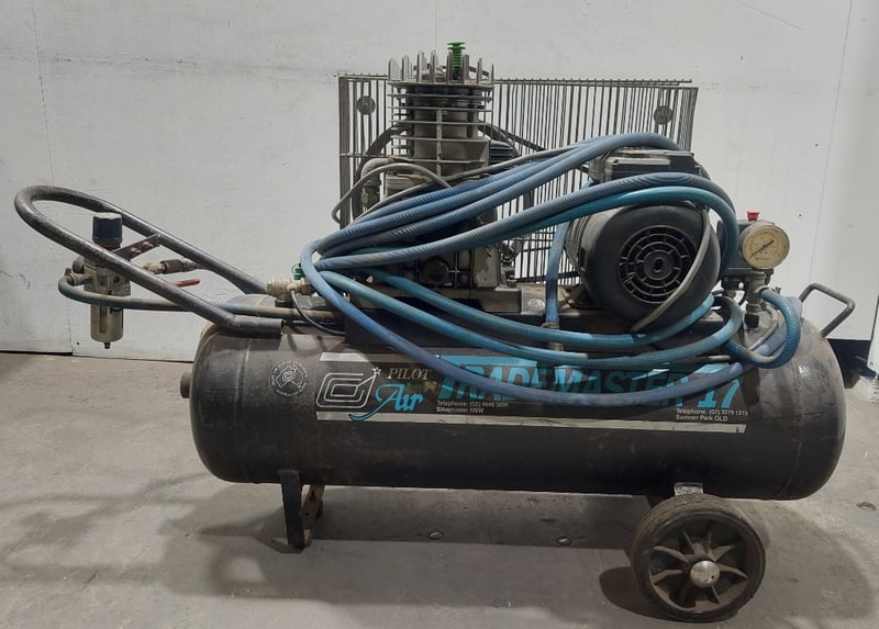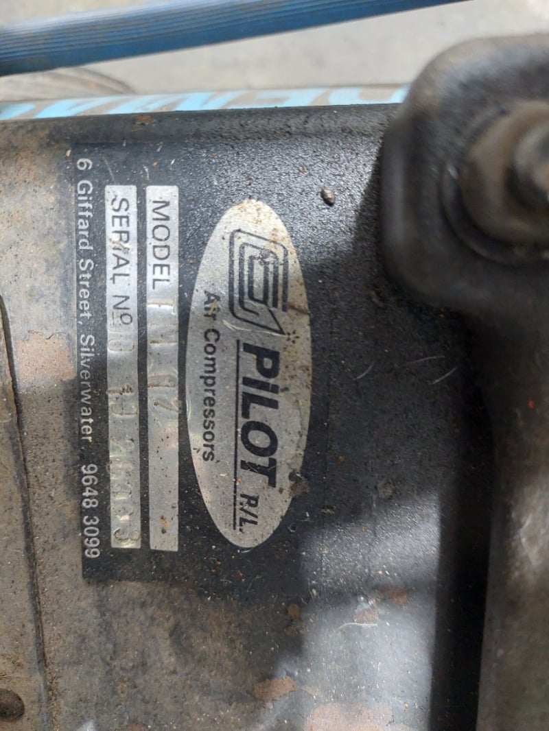 Pilot Air TM17 Trade Master 17 air compressor. Model: TM17Serial number:001028363Dims:170cm L, 38cm W, 72cm HNote: item is untested, signs of wear.
