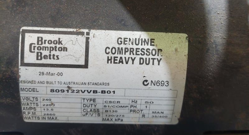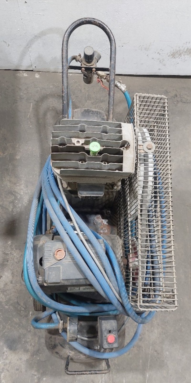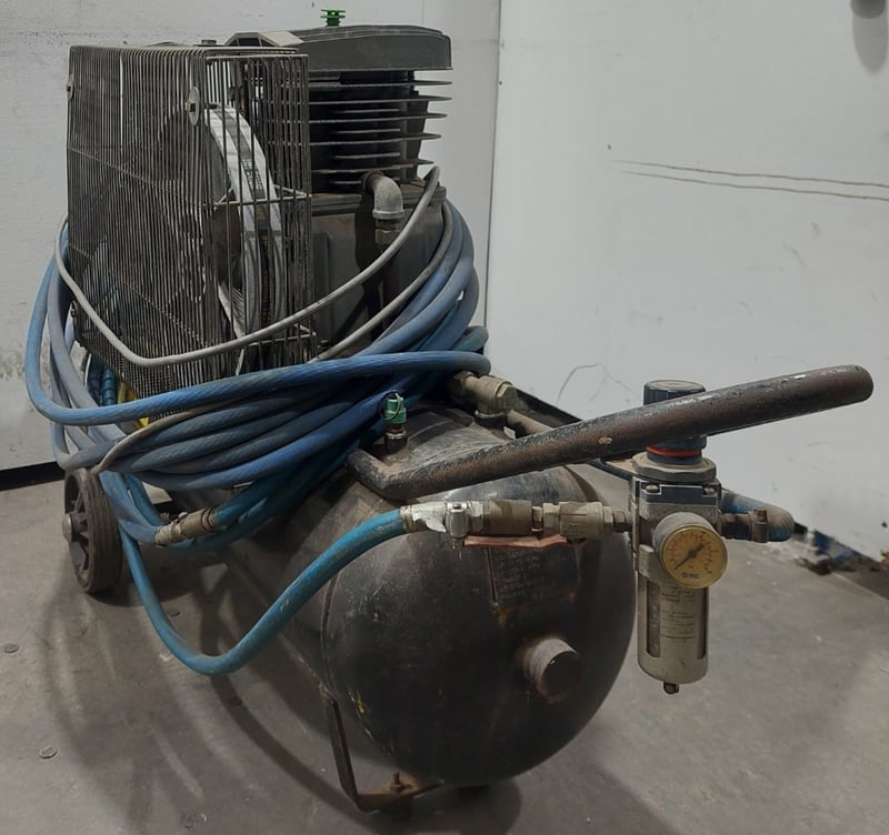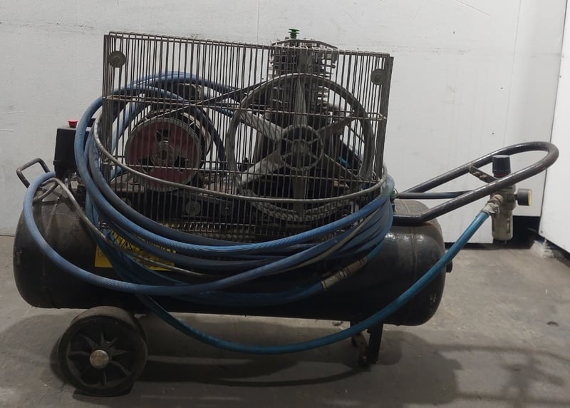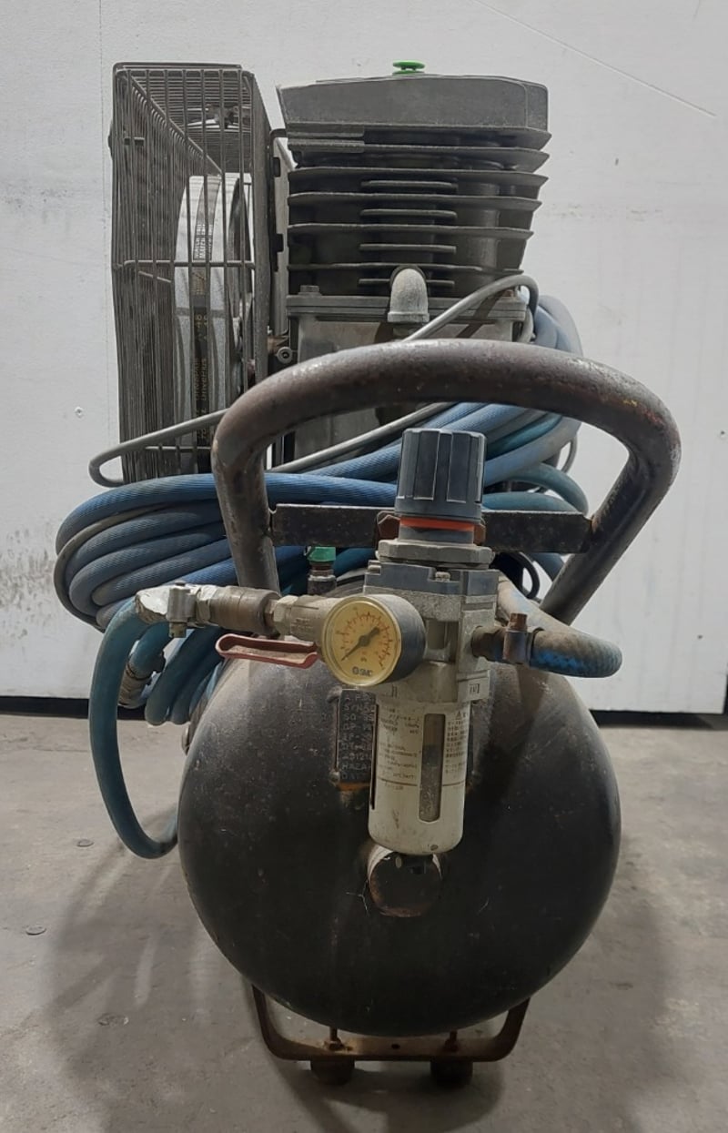 Pilot Air TM17 Trade Master 17 air compressor. Model: TM17Serial number:001028363Dims:170cm L, 38cm W, 72cm HNote: item is untested, signs of wear.