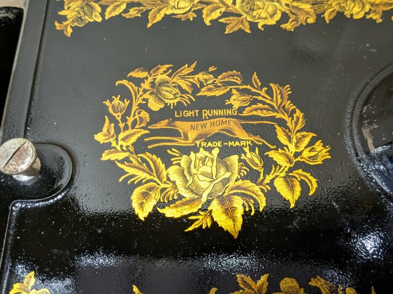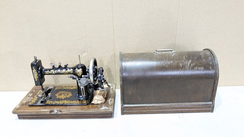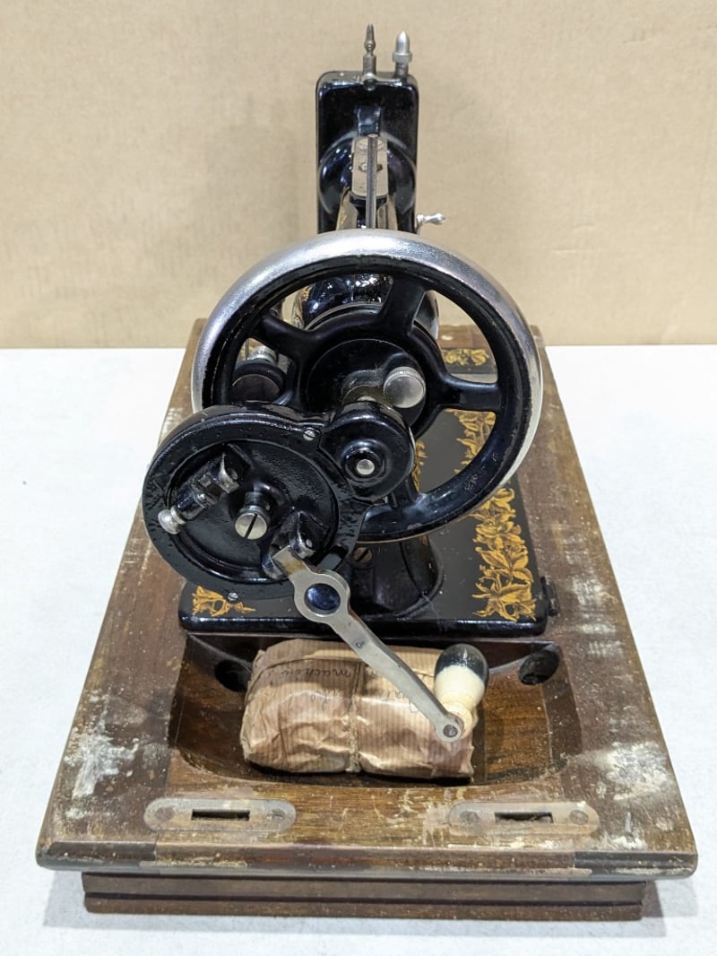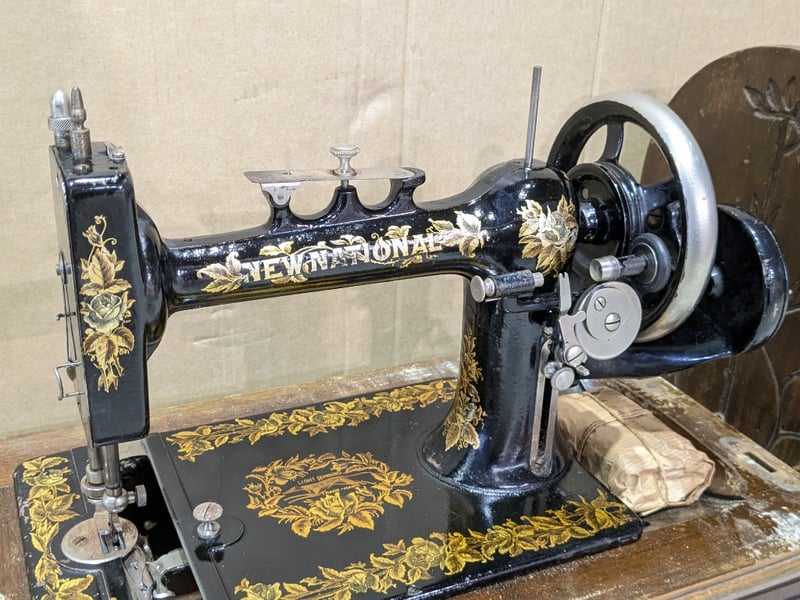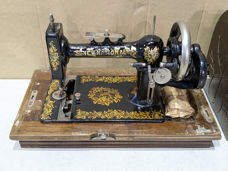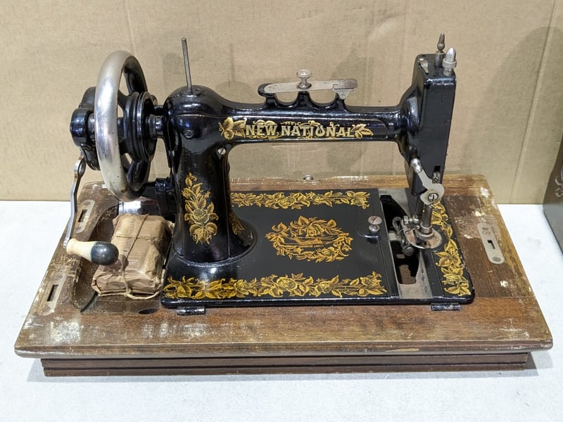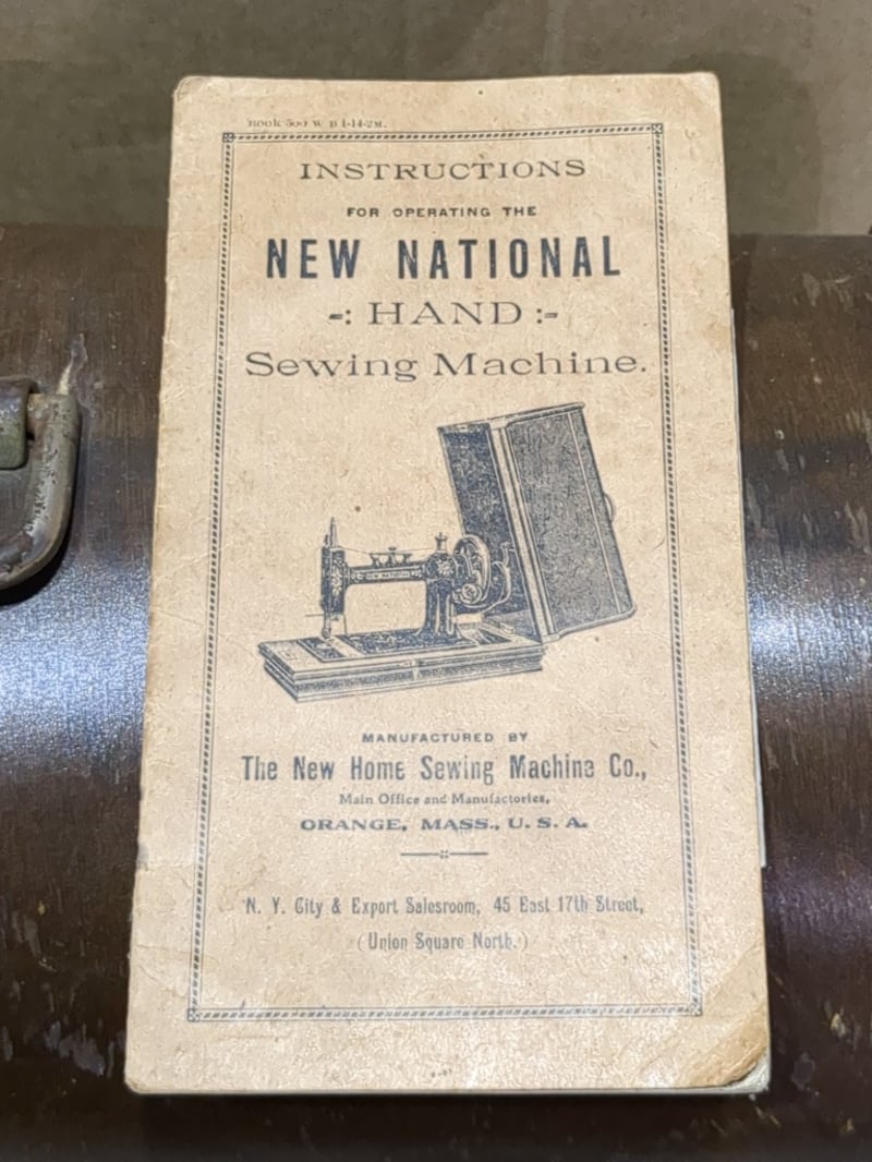 Sewing machine, vintage New National hand-crank sewing machine with instructions