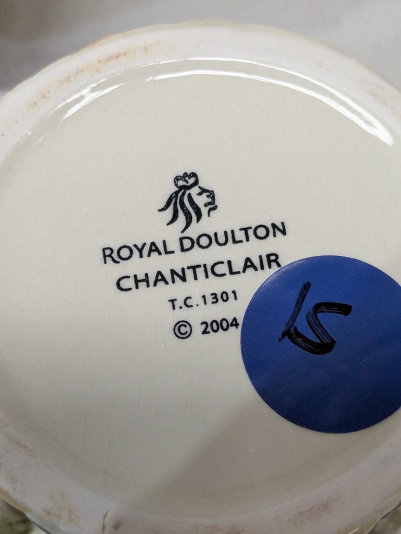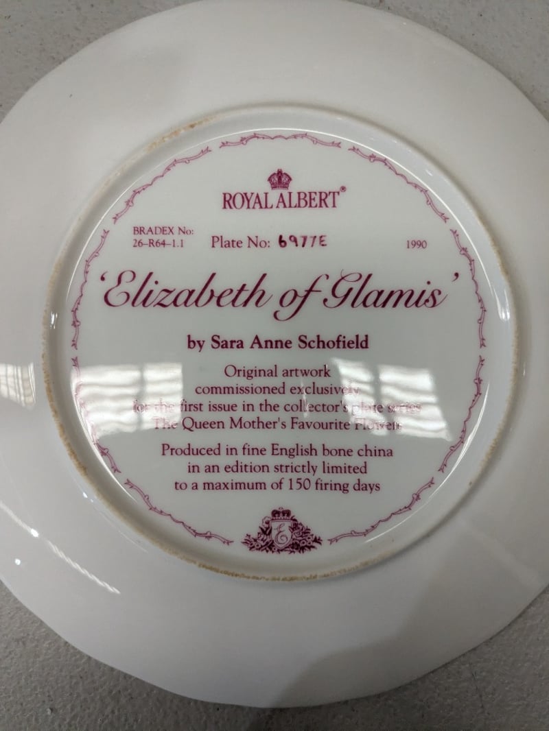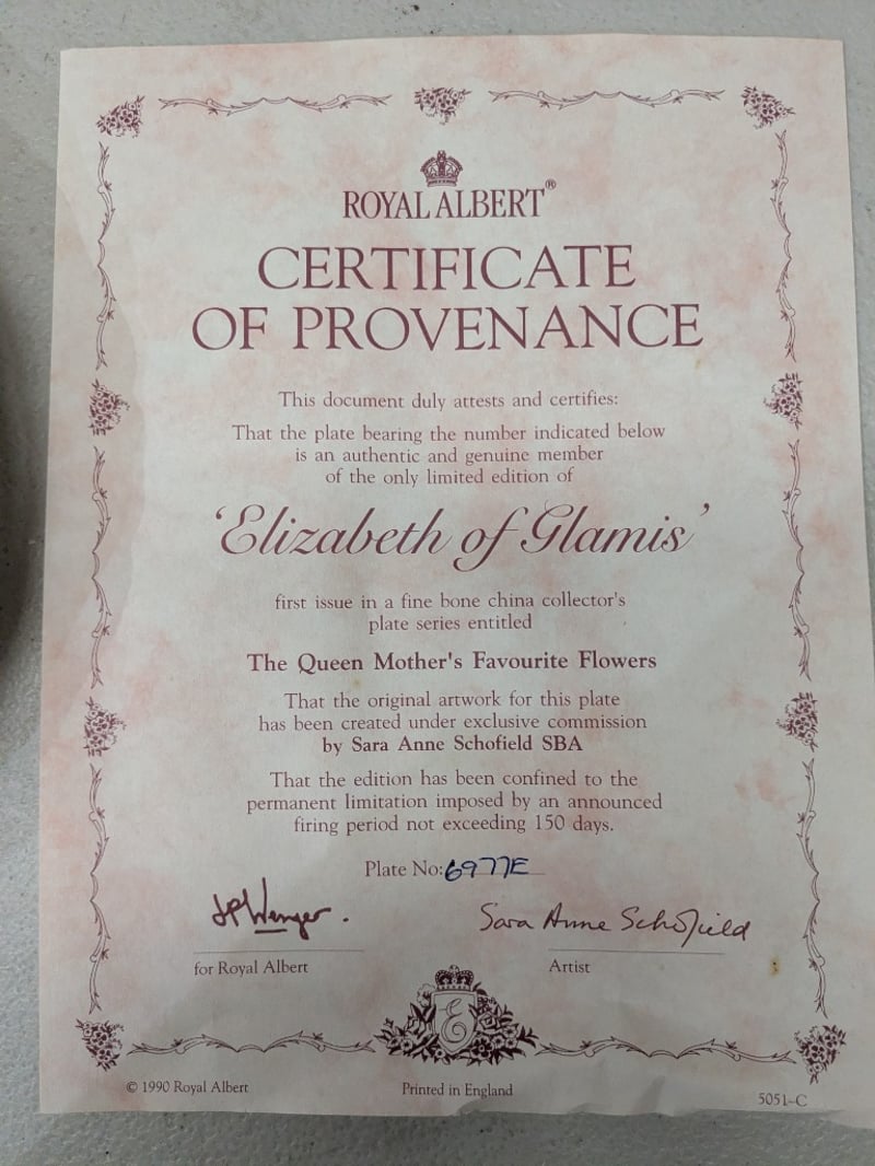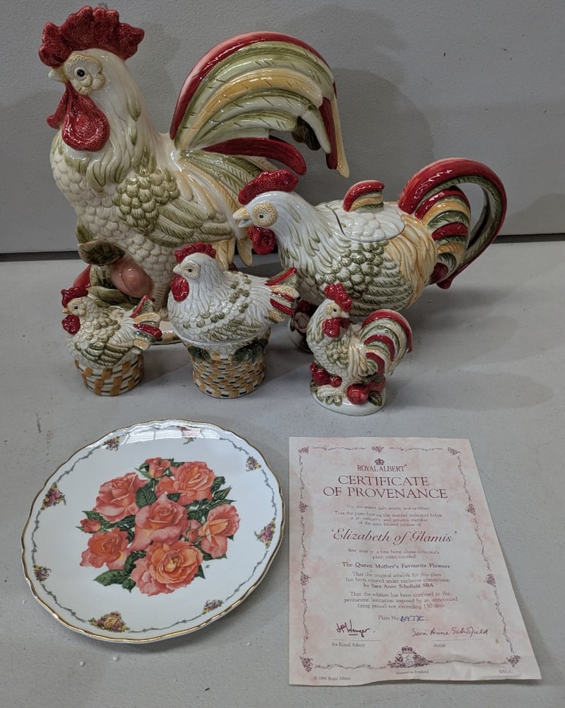 ROYAL ALBERT "ELIZABETH OF GLAMIS" LIMITED EDITION PORCELAIN COLLECTION WITH ROYAL DOULTON CHANTICLAIR TUREEN COLLECTION Exceptional Fine Bone China Collection Comprising Royal Albert "Elizabeth Of Glamis" Plate (Plate No. 6917E) From The Queen Mother'S Favourite Flowers Series, Limited To 150 Firing Days, With Certificate Of Provenance. Features Hand-Painted Coral Roses By Artist Sara Anne Schofield. Accompanied By Royal Doulton Chanticlair Ceramic Tureen (2004) With Woven Basket Base And Removable Lid, Plus Four Decorative Rooster Figurines In Cream, Red And Green Glazes With Basket-Weave Bases. The Collection S Condition: Good - Refer To Images 584584+23