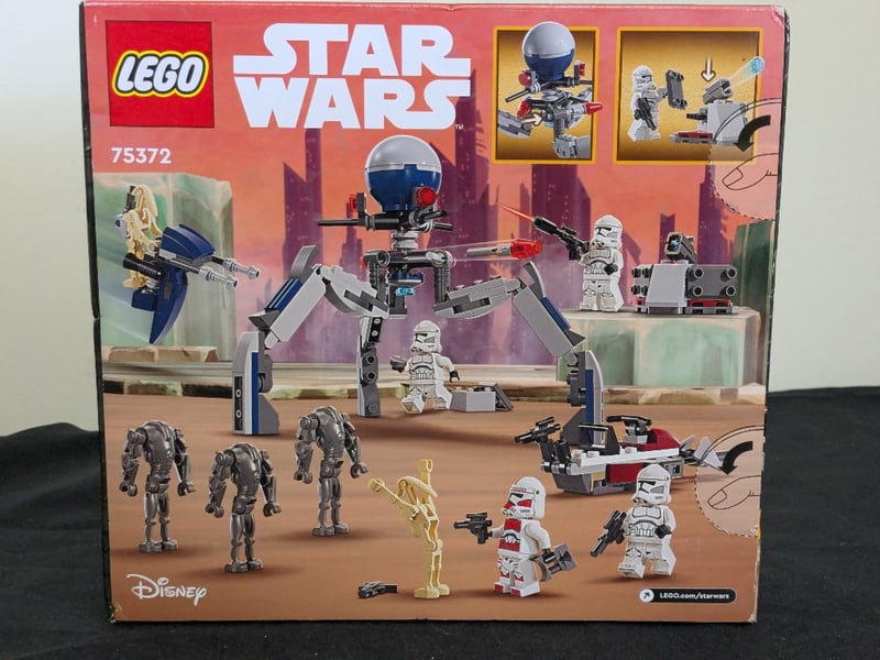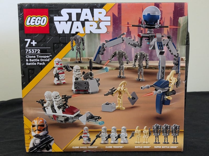 Sealed Lego Star Wars Set 75372 Featuring Clone Trooper Minifigures, Battle Droids, A Clone Shock Trooper, Super Battle Droid, And Articulated Droid Figures With Accessory Weapons And Vehicles Including A Speeder Bike And Battle Droid Transport Platform. Age 7+ Set In Original Factory-Sealed Packaging.
