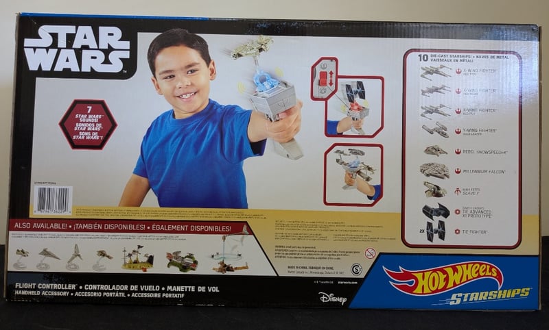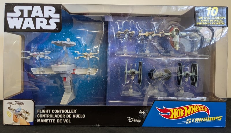 HOT WHEELS STAR WARS STARSHIPS FLIGHT CONTROLLER SET WITH 10 DIE-CAST VEHICLESHot Wheels Star Wars Starships Collection Featuring Handheld Flight Controller With 10 Metallic Die-Cast Starship Replicas Including X-Wing Fighters, Tie Fighters, Millennium Falcon, And Rebel Snowspeeder. Original Packaging With Multilingual Labeling. Includes Display Stand And Collectible Spacecraft Models From The Star Wars Saga.Condition: Good - Refer To Images584522+170