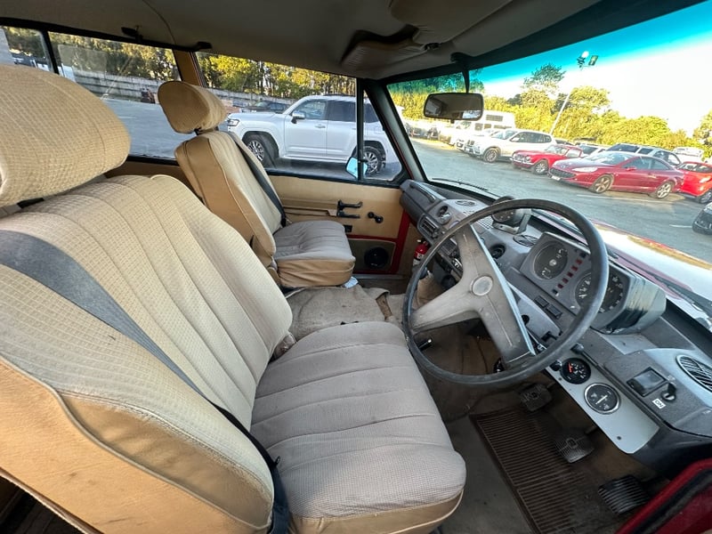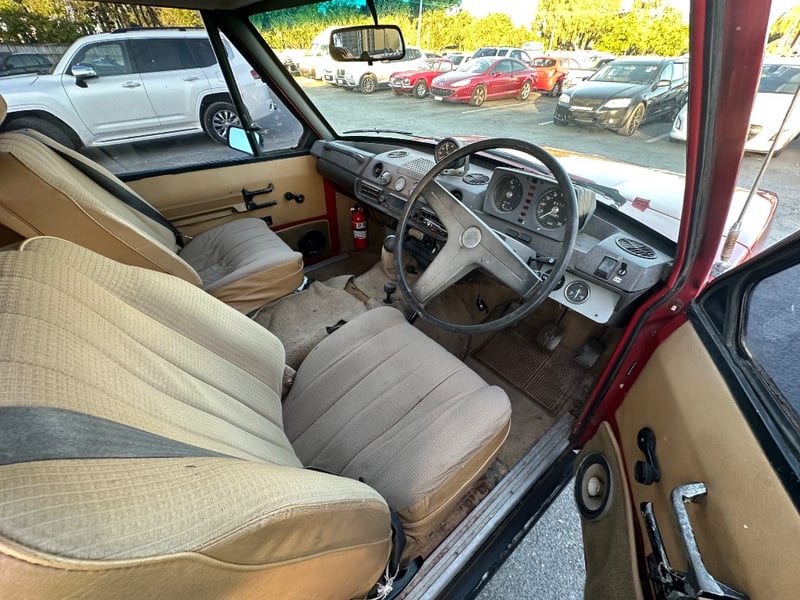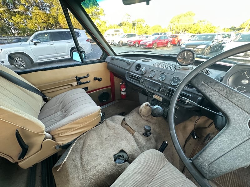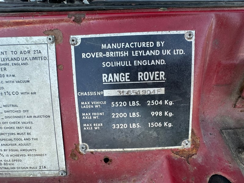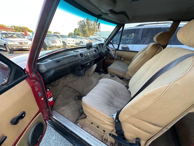 Description/extras: Presented is a remarkable 1972 Rover Range Rover Series I, a genuine pioneering four-wheel-drive SUV manufactured by Rover-British Leyland in Solihull, England. This iconic vehicle features the original 3.5-litre V8 engine paired with a manual four-speed transmission, delivering authentic period performance. The burgundy exterior is complemented by a tan and grey interior with original specification seating for five occupants. The odometer displays approximately 90,881 kilometres. Right-hand drive configuration. This Series I represents the foundational design that established the Range Rover as a globally recognised adventure vehicle, combining practical off-road capability with civilised on-road comfort—a benchmark achievement in automotive engineering. Surface rust evident on undercarriage and floor panels, minor corrosion on door seams, weathered door seals, worn interior trim and carpeting, original upholstery showing age-related patina, scuffed dashboard, worn steering wheel grip, aged weatherstripping.. Inspection recommended.