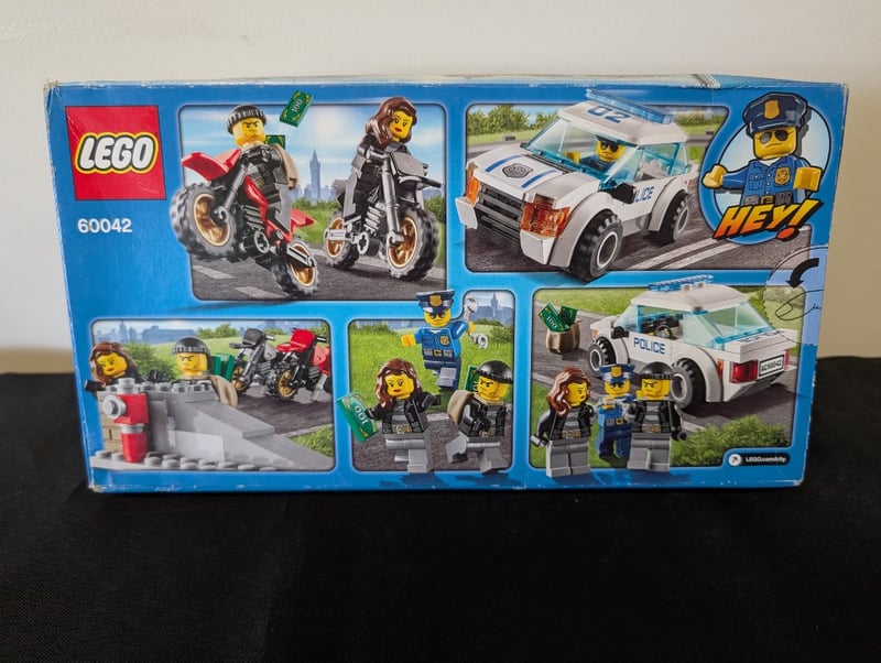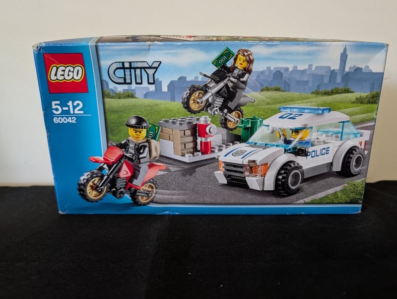 LEGO CITY POLICE CHASE SET 60042 (5-12 YEARS) Item Size: Height: 22cm, Width: 38cm, Depth: 12cm, Weight: 2Kg Lego City Set 60042 Featuring Police Pursuit Theme With Motorized Motorcycle, Police Car, And Minifigure Accessories Including Officer And Criminal Characters With Building Elements For Street Scene. Condition: Good - Refer To Images 655508+146