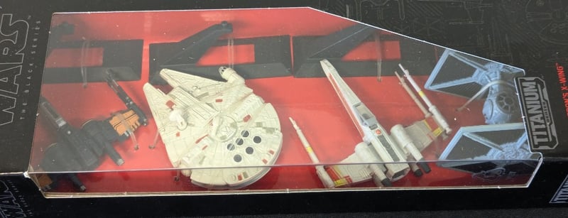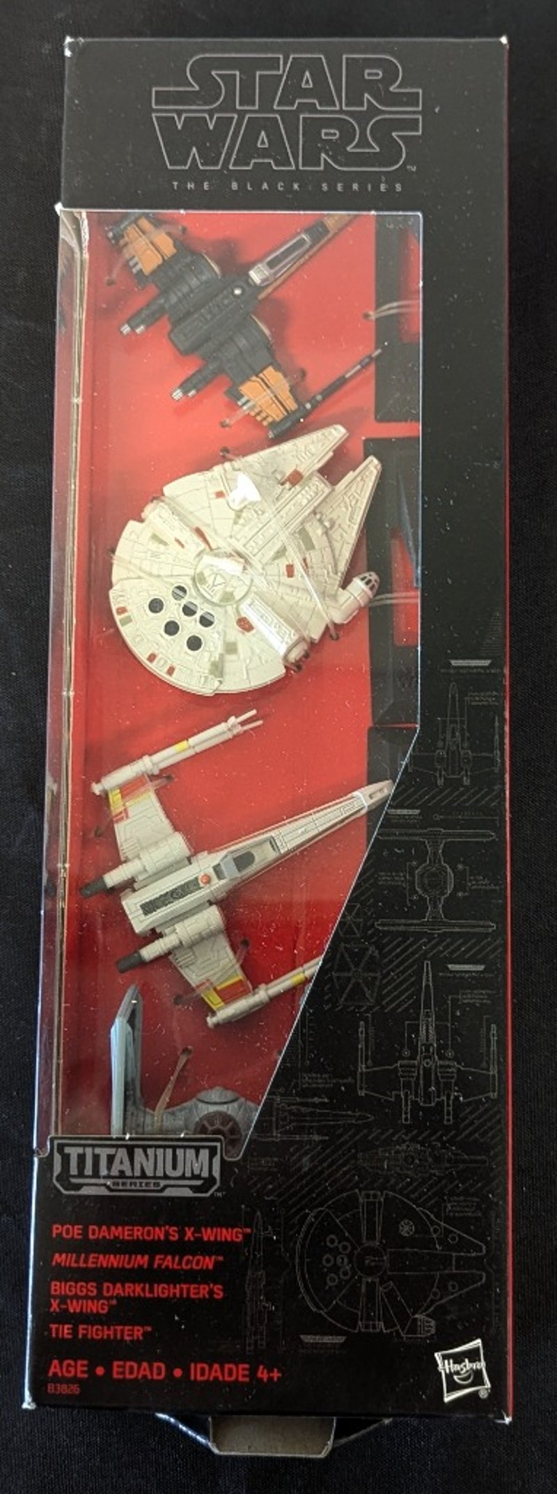 STAR WARS THE BLACK SERIES TITANIUM COLLECTION - FOUR STARSHIP SETStar Wars The Black Series Titanium Collection Die-Cast Starship Set Featuring Poe Dameron'S X-Wing, Millennium Falcon, Biggs Darklighter'S X-Wing, And Tie Fighter. Includes Detailed Technical Schematics And Blueprint Reference Materials. Die-Cast Metal Construction With Painted Detail Work.Condition: Fair - Refer To Images584525+31