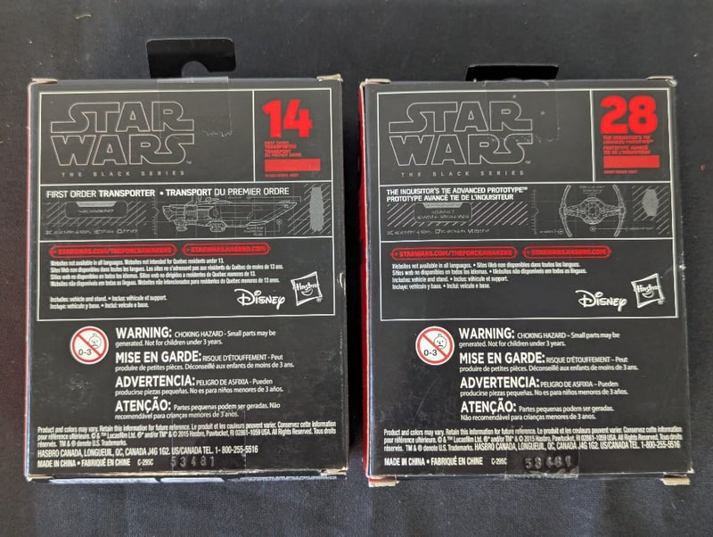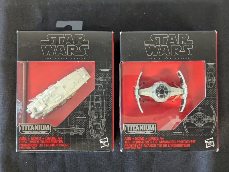 STAR WARS THE BLACK SERIES TITANIUM SERIES DIE-CAST VEHICLE COLLECTION - FIRST ORDER TRANSPORTER & INQUISITOR'S TIE ADVANCED PROTOTYPELot Comprising Two Star Wars The Black Series Titanium Series Die-Cast Collectible Vehicles. Includes First Order Transporter (Item #14) Featuring Detailed Cargo Transport Design With Articulated Landing Gear And Structural Paneling. Accompanied By The Inquisitor'S Tie Advanced Prototype (Item #28) Showcasing Extended Solar Panel Wings, Reinforced Fuselage, And Precision Engineering Characteristic Of Imperial Fighter Craft Variants. Both Vehicles Display Cream And Grey Factory Finish With ApplieCondition: Good - Refer To Images584525+52