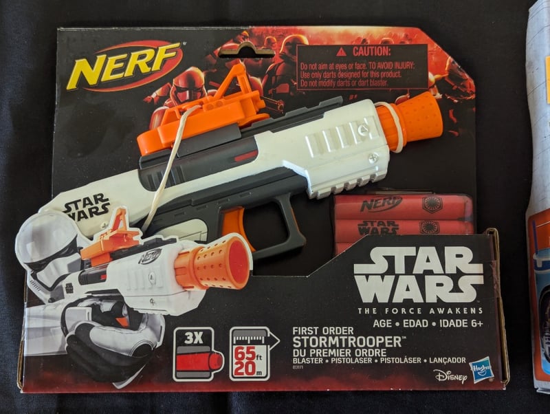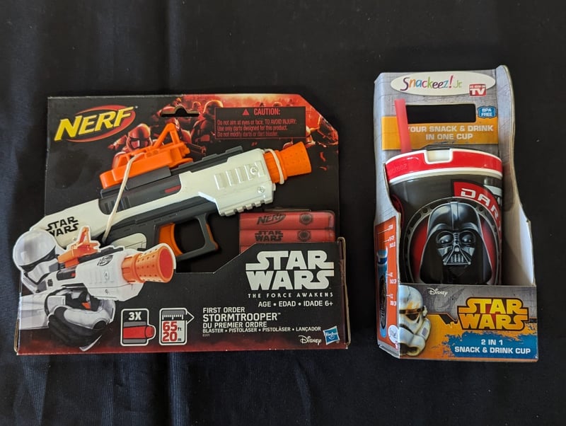 Star Wars Merchandising Lot Comprising A Nerf First Order Stormtrooper Blaster From The Force Awakens Series Featuring Orange And Cream Detailing With Three Dart Cartridges And 65Ft/20M Firing Range, Paired With A Snackeez Jr. 2-In-1 Snack And Drink Cup In Darth Vader Design. The Blaster Displays Tactical Rail Accessories And Removable Sight Mechanism.