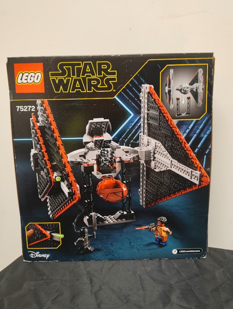 Lego Star Wars Sith Tie Fighter (Set 75272) Featuring An Articulated Red And Black Starfighter With Opening Cockpit, Poseable Wings, And Detailed Minifigure Accessories. Box Shows Minor Wear Consistent With Storage And Display. Includes Illustrated Packaging With Construction Imagery And Character Lineup. Age Rating 9+ Indicated On Box. Disney/Lego Branding Present.