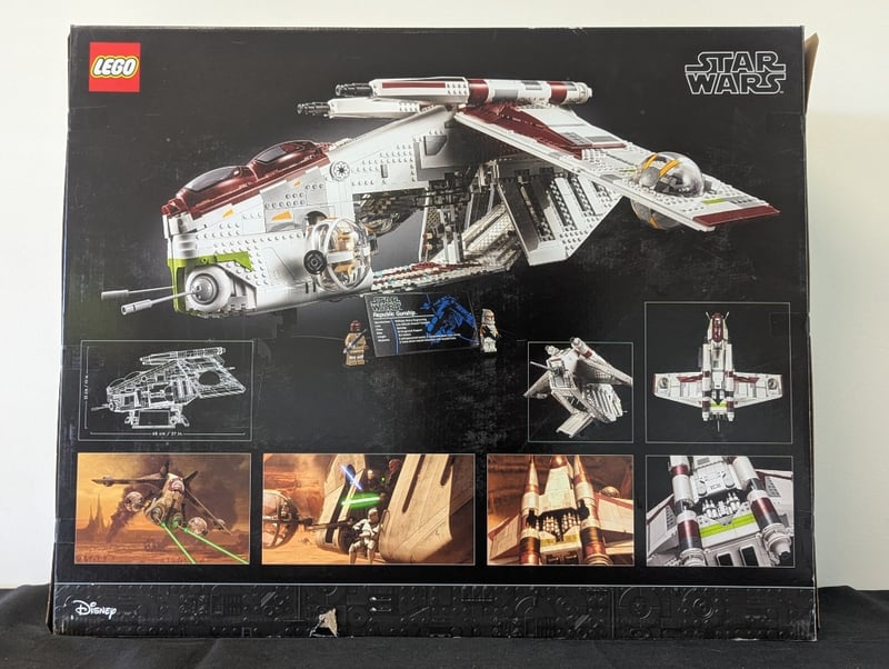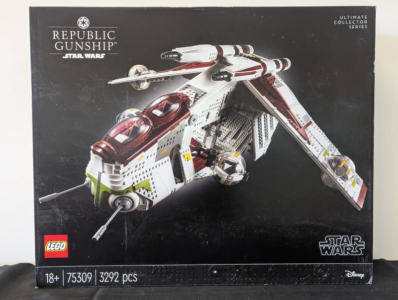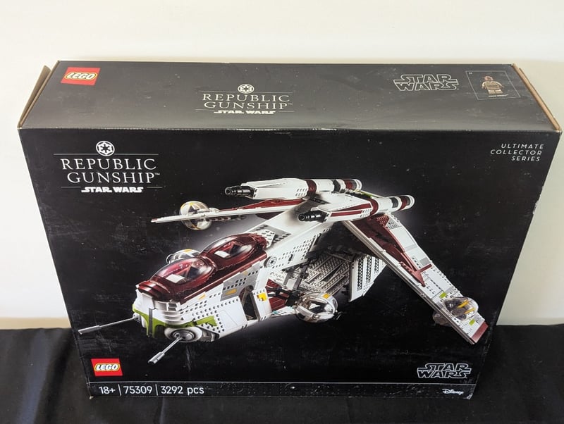 LEGO Star Wars Ultimate Collector Series Republic Gunship – 75309 Official LEGO Star Wars Ultimate Collector Series (UCS) set 75309 Republic Gunship (LAAT/i) – iconic Clone Wars / prequel era gunship Age range: 18+ 3,292 pieces Retired set (released 2021) Includes: Massive, highly detailed display model with opening cockpit, rotating turrets, articulated wings, and intricate interior Premium build experience designed specifically for adult collectors Perfect condition box with clean graphics. This is one of the most impressive and sought-after UCS sets a standout display piece for serious Star Wars and LEGO collectors. 584526+107