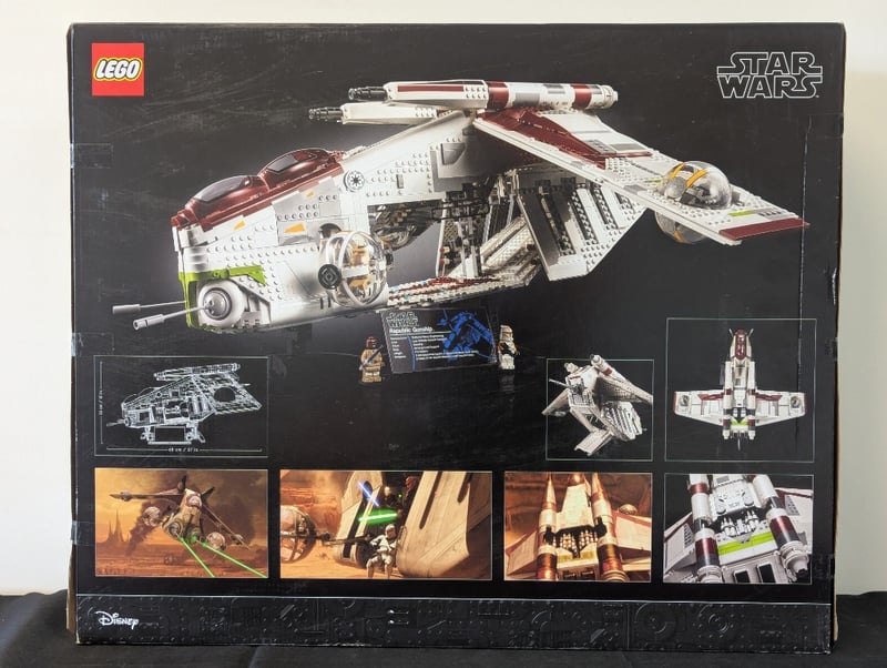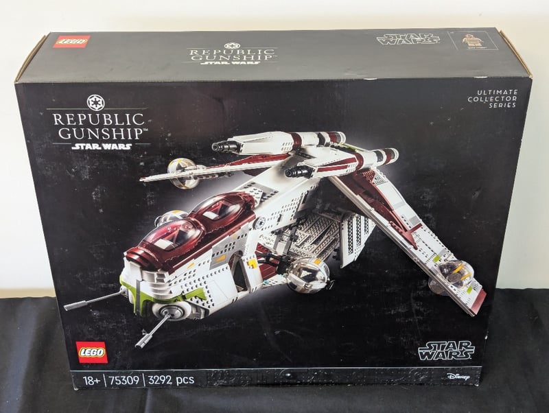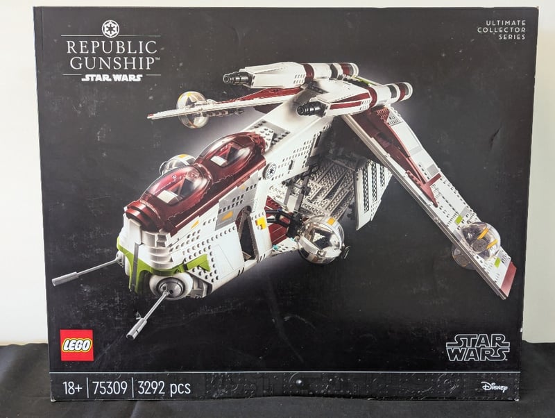 LEGO Star Wars Ultimate Collector Series Republic Gunship – 75309 Official LEGO Star Wars Ultimate Collector Series (UCS) set 75309 Republic Gunship (LAAT/i) – iconic Clone Wars / prequel era gunship Age range: 18+ 3,292 pieces Retired set (released 2021) Includes: Massive, highly detailed display model with opening cockpit, rotating turrets, articulated wings, and intricate interior Premium build experience designed specifically for adult collectors Perfect condition box with clean graphics. This is one of the most impressive and sought-after UCS sets a standout display piece for serious Star Wars and LEGO collectors. 584526+108