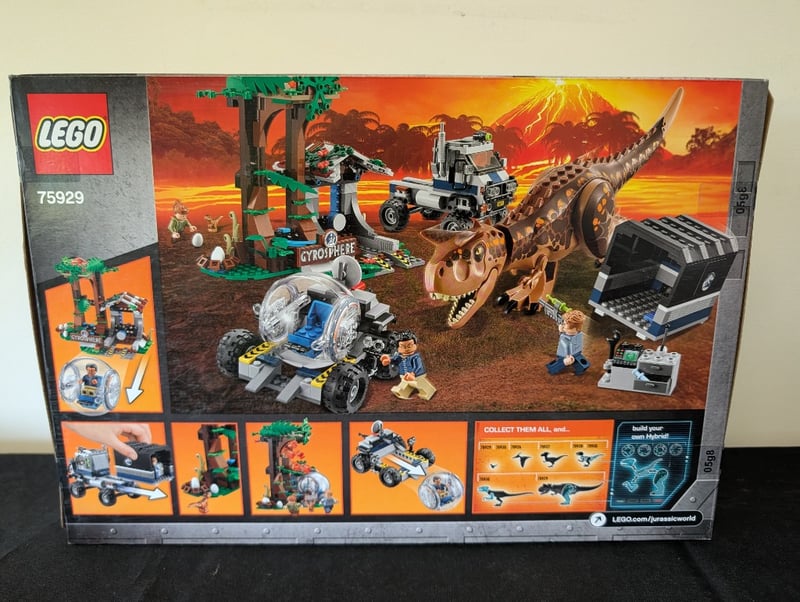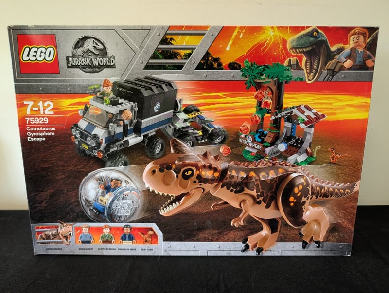 LEGO JURASSIC WORLD CARNOTAURUS GYROSPHERE ESCAPE SET 75929Item Size: Height: 40cm, Width: 35cm, Depth: 35cm, Weight: 2KgComplete Lego Jurassic World Set 75929 Featuring A Buildable Carnotaurus Dinosaur, Motorized Gyrosphere Vehicle With Transparent Dome Cockpit, Armoured Transport Truck, Jungle Outpost Structure, And Five Minifigures Including Dr. Ellie Sattler And Franklin Webb. Includes Rotating Dinosaur Head, Opening Truck Hatch, And Detailed Landscape Elements.Condition: Good - Refer To Images584530+173