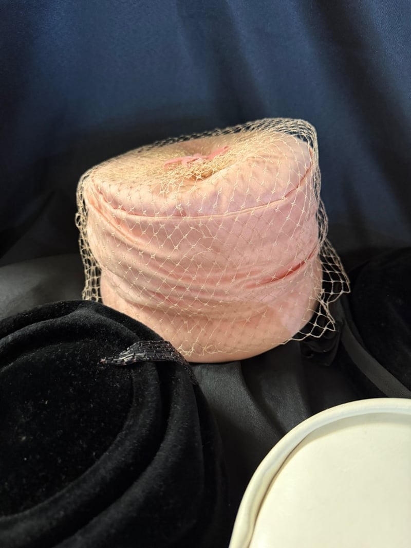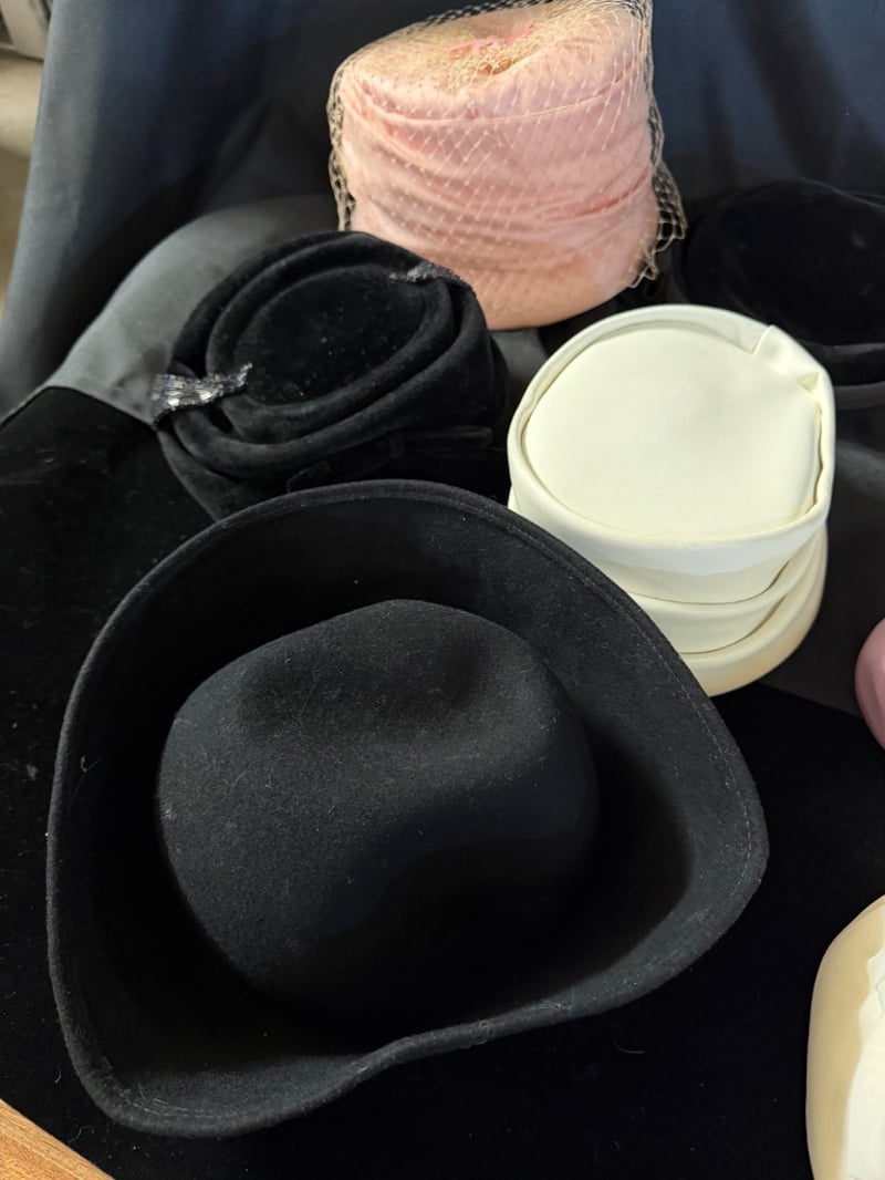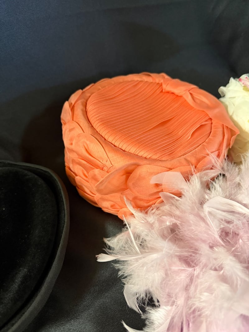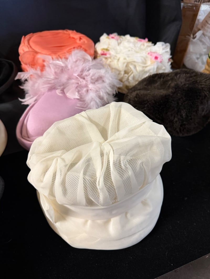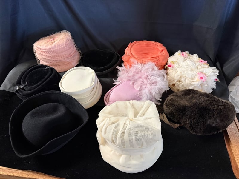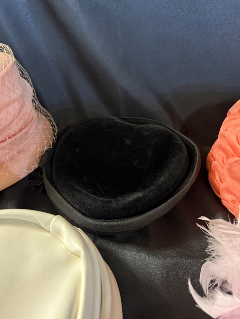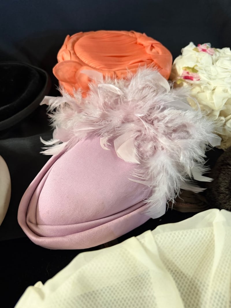 Curated Collection Of Fascinators And Formal Hats Featuring Elegant Construction With Textured Fabrics, Feathered Details, And Floral Embellishments.