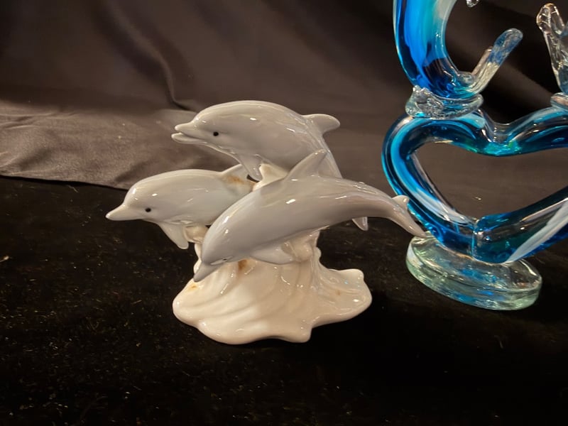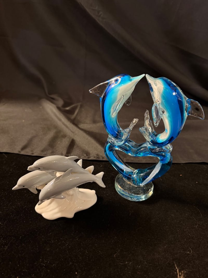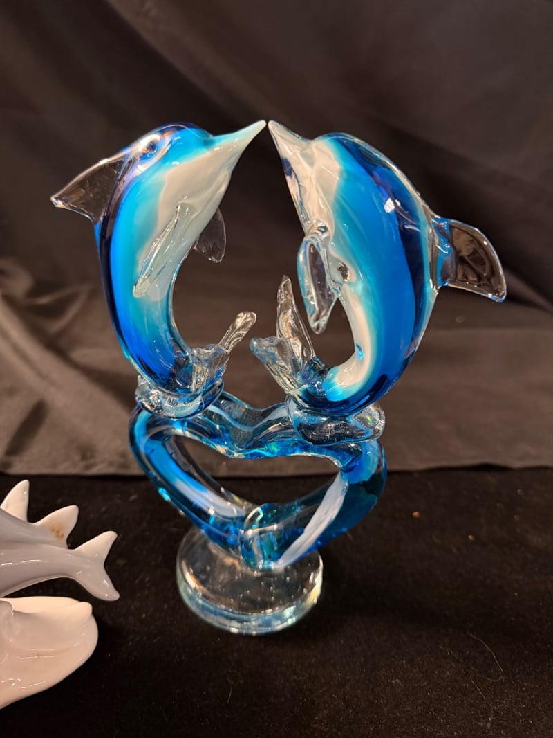 PAIR OF GLASS DOLPHIN FIGURINES - BLUE AND WHITE Exquisite Glass Figurine Set Comprising A Striking Blue Glass Dolphin Pair Sculpture With Translucent Cream And Cobalt Colouring Condition: Good - Refer To Images 584520+95
