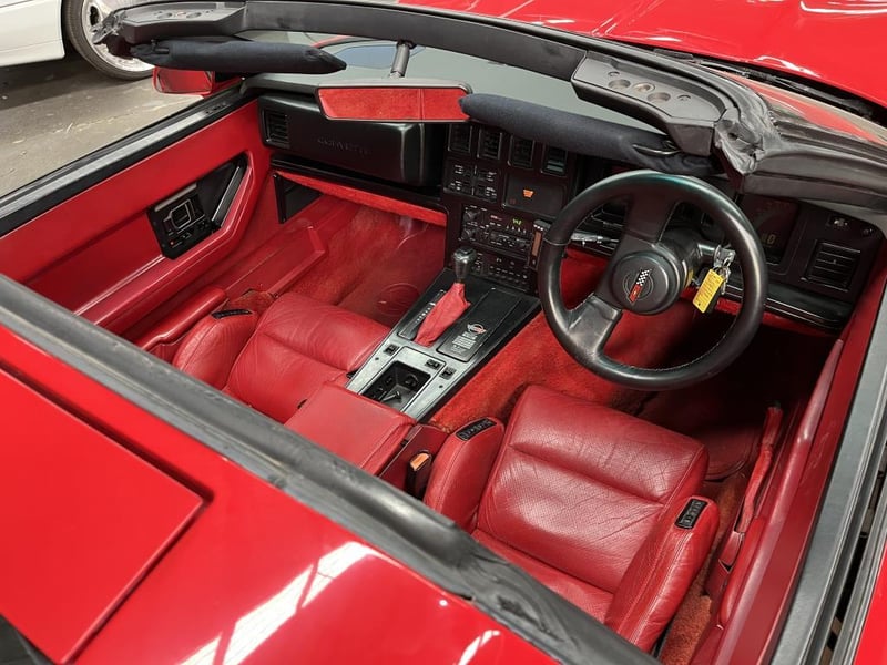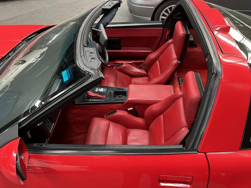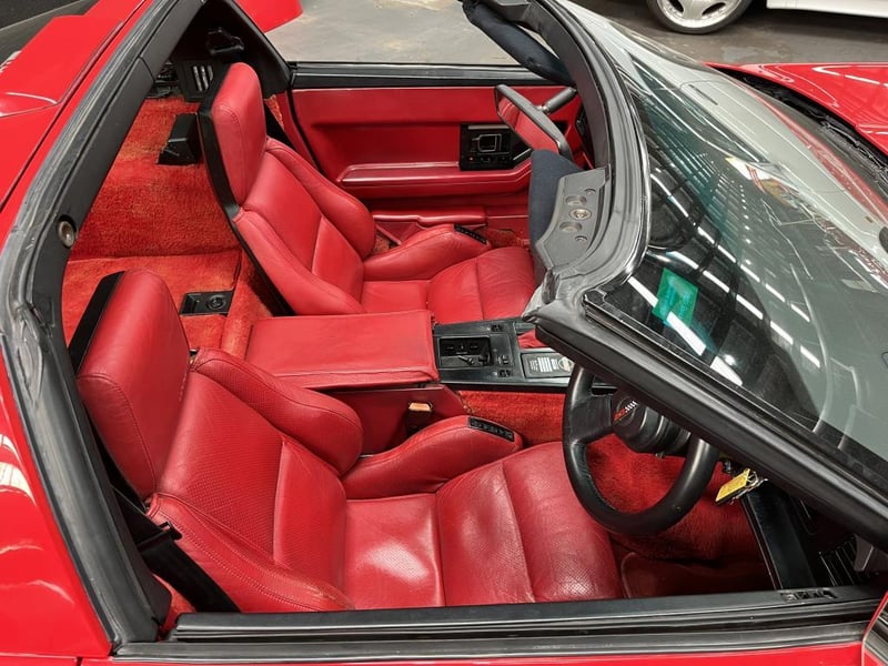 Red over red, and both are in great shape. The exterior paint is deep and glossy with no visible damage. The red leather sport seats show minimal wear, carpets are clean, and all trim is intact. A new battery has been fitted and the original 1987 Corvette owner's manual and key fob are included. The original Delco-Bose stereo has been replaced with an aftermarket Kenwood unit.