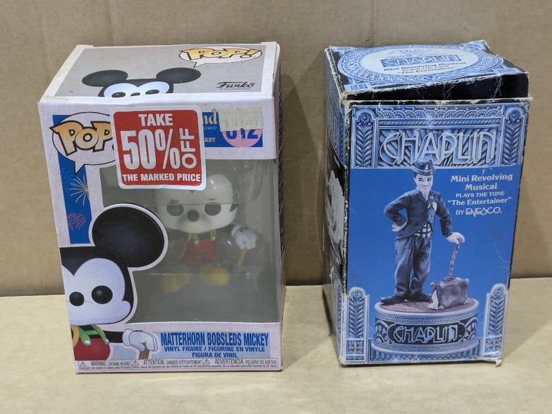 Figurines, includes Chaplin mini revolving musical and Pop Vinyl MatterHorn Bobsleds Mickey