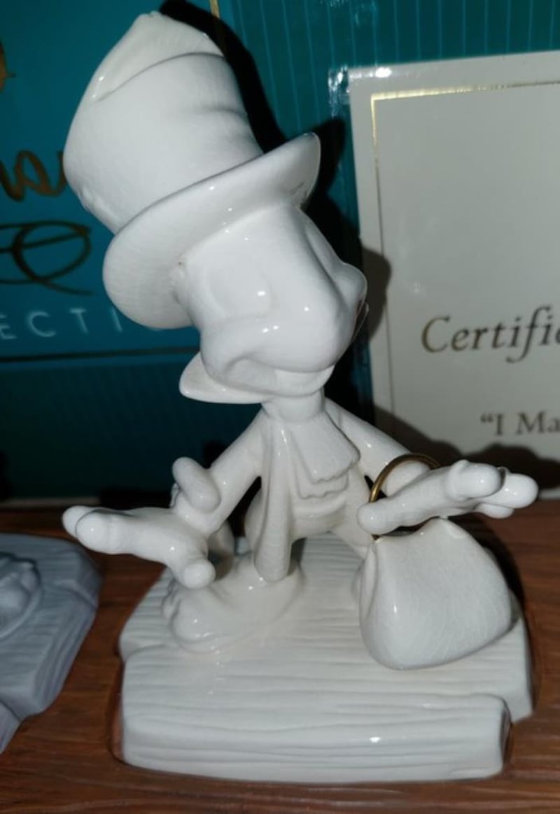 CLASSICS WALT DISNEY COLLECTION JIMINY IMAGINATION TO REALITYThe Journey Of Jiminy Cricket From Image To Reality Features 3 Figurines On A Wooden Base Whiteware , Resin Master , Painted Resin . The Last Space Is For Jiminy Cricket Painted Whiteware Sold Seperately Item 1217937.Size: WOODEN BASE 38 x 8 x 1.5cm FIGURINES HEIGHT 2 x 12cm 1 x 11cm BOX SIZE 19x38x29xcmCondition: Good - Refer To Images233675+1