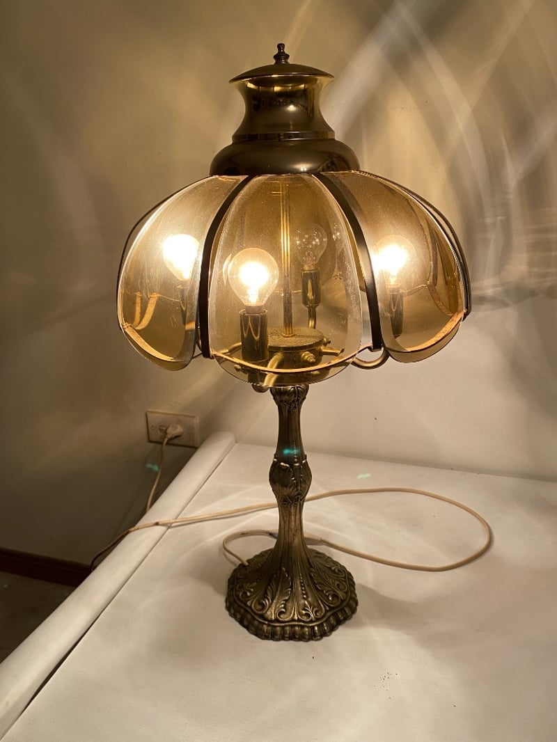 DECORATIVE BRASS BASE TABLE LAMP WITH BRONZE GLASS CANOPY WITH 4 GLOBES