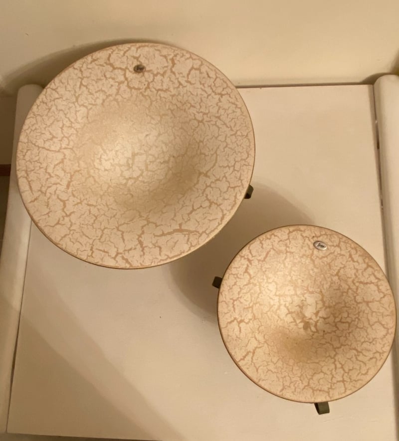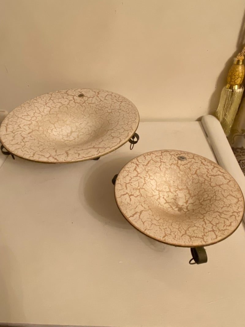 PAIR OF CREAM STONE WITH GOLD STRAINS THROUGHOUT AND GOLD EDGE DISPLAY DISHES – ONE SMALL 27CM AND ONE LARGE 40CM IN CIRCUMFERENCE ON STEEL DISPLAY STAND 657068+19