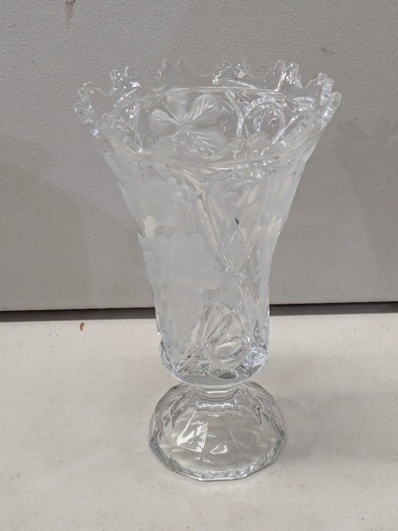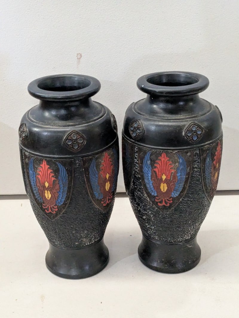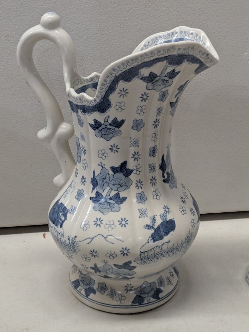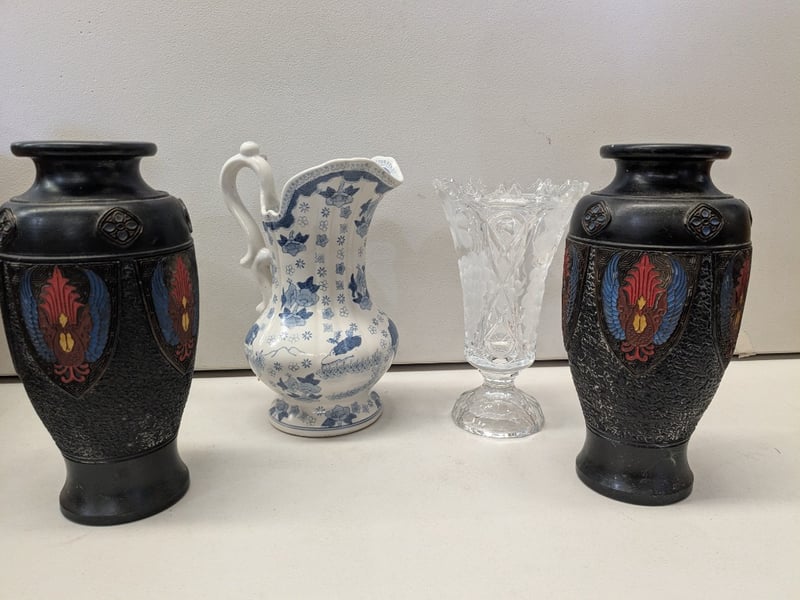 A Curated Collection Comprising A Pair Of Black Lacquered Vases With Polychrome Enamel Decoration Featuring Red And Blue Floral Medallions, A Blue And White Porcelain Pitcher With Hand-Painted Botanical Motifs, And Two Clear Crystal Vessels Including A Pedestal Vase With Relief-Cut Floral Patterns And A Footed Urn With Scalloped Rim Detailing. The Black Vases Display Intricate Surface Texturing With Applied Decorative Roundels, Characteristic Of Asian Export Wares. The Porcelain Pitcher Exhibits