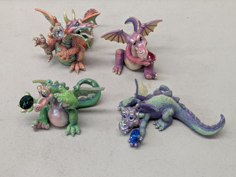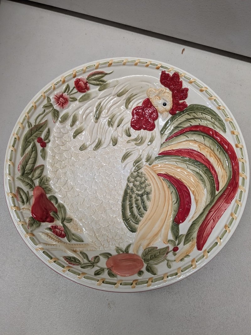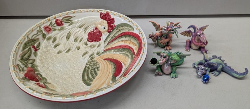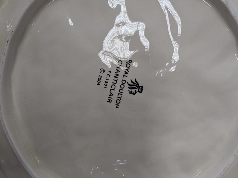 Royal Doulton Hand-Painted Ceramic Plate Featuring A Cream-Glazed Body With Relief-Moulded White Cockerel And Vibrant Floral Sprays In Red, Green, And Ochre Tones. Decorative Border With Gilt Detailing. Accompanied By Four Limited Edition Wood Dragons Collectible Figurines (Cocky, Lucky, Sneaky, And Fluttery) With Hand-Painted Details In Purple, Green, Pink, And Teal.