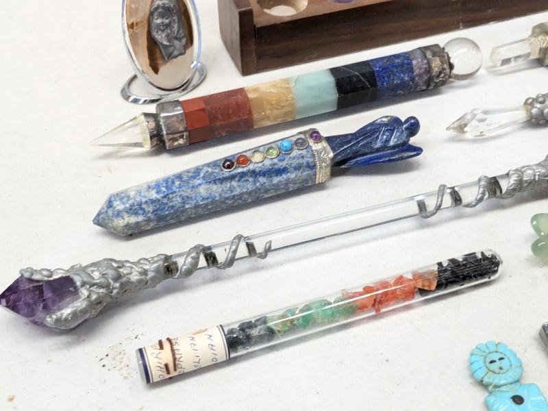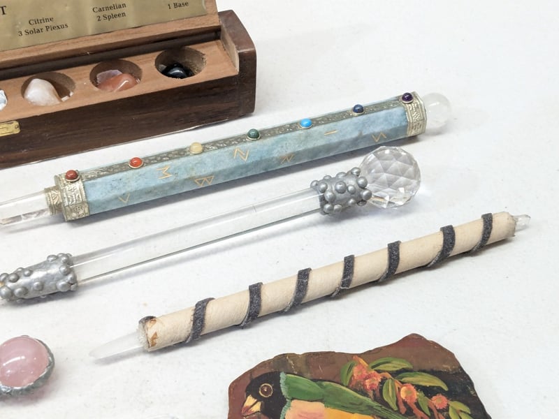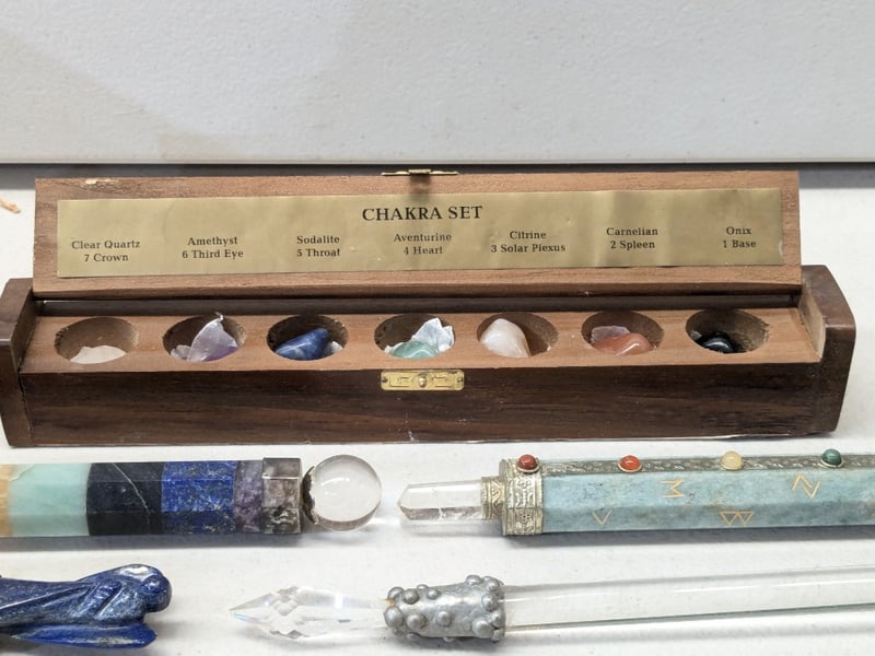 CHAKRA SET WITH SEVEN CRYSTAL WANDS, WOODEN DISPLAY BOX, AND METAPHYSICAL ACCESSORIES
