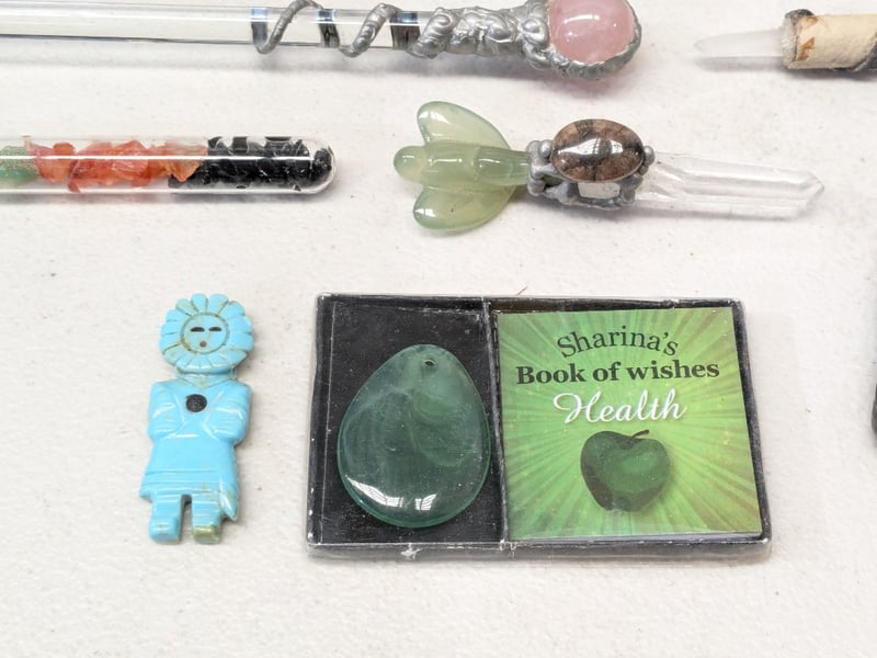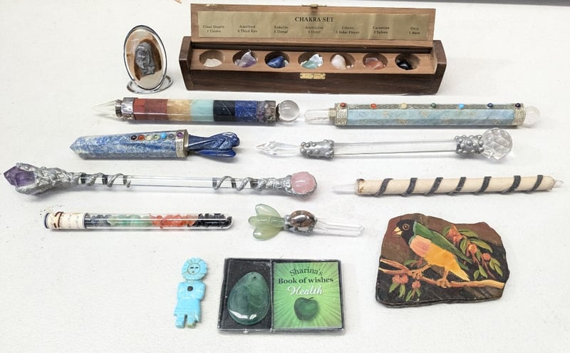 Comprehensive Chakra Collection Featuring Wooden Display Box Containing Seven Polished Stones (Clear Quartz, Amethyst, Sodalite, Aventurine, Citrine, Carnelian, Onyx), Seven Glass Wands With Semi-Precious Stone Terminals And Chakra-Aligned Mineral Segments, Lapis Lazuli Wand With Chakra Stones, Multi-Segment Healing Wand, Rose Quartz Sphere, Turquoise Figurine, Decorative Painted Slate Bird Plaque, "Sharina'S Book Of Wishes Health" Gift Set With Green Aventurine Stone, And Additional Crystal Acc