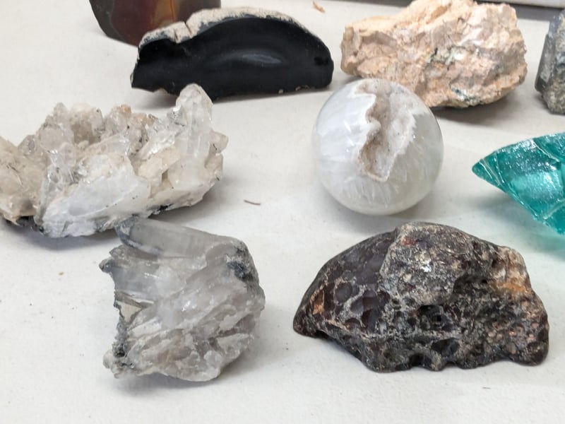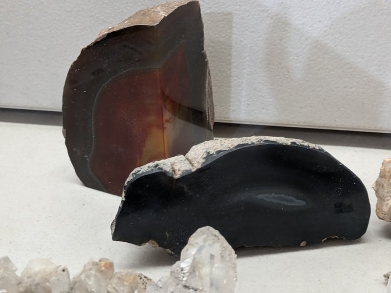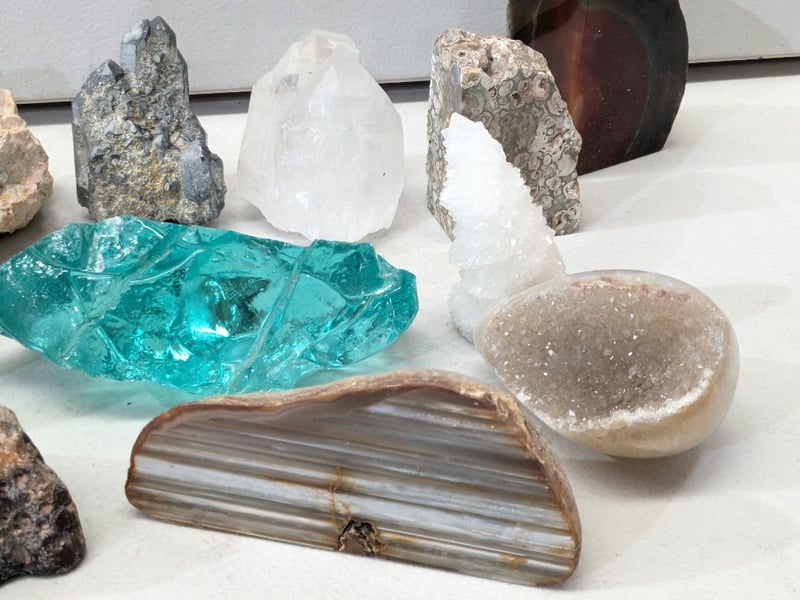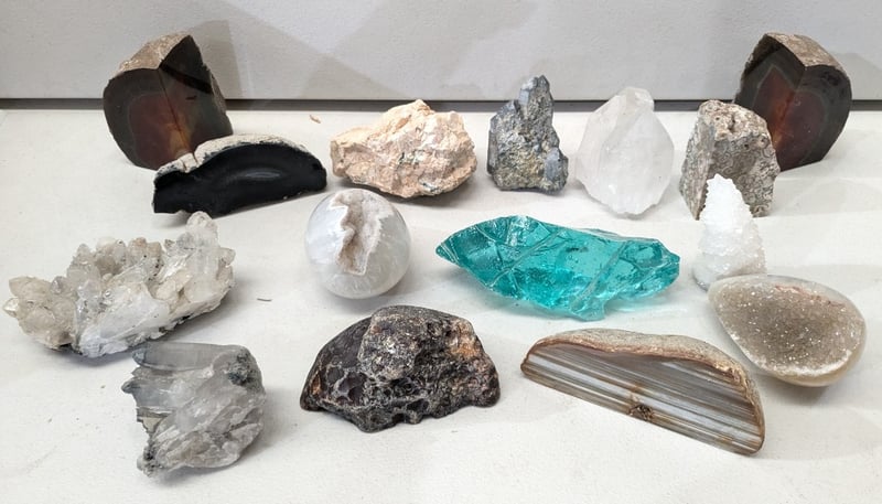 CURATED MINERAL AND CRYSTAL SPECIMEN DECORATIVE COLLECTION A Diverse Assemblage Of Natural Minerals And Crystals Featuring Raw And Polished Specimens. The Collection Includes Striking Turquoise-Hued Aquamarine Or Tourmaline Crystal Fragments Displaying Brilliant Transparency And Vitreous Lustre; White Quartz Specimens Exhibiting Both Raw Crystalline And Geode Formations; Banded Agate Or Striped Mineral Slices With Warm Brown And Cream Striations; Dark Mahogany-Toned Polished Stones With Translucent Qualities; Grey Metallic Mineral Specimens; And Fossili Condition: Good - Refer To Images 584584+8