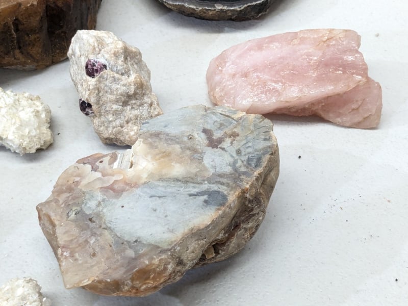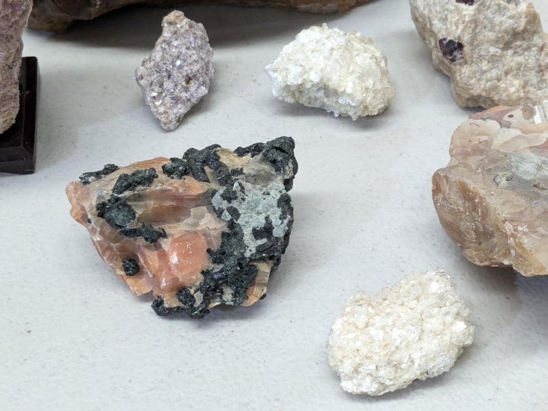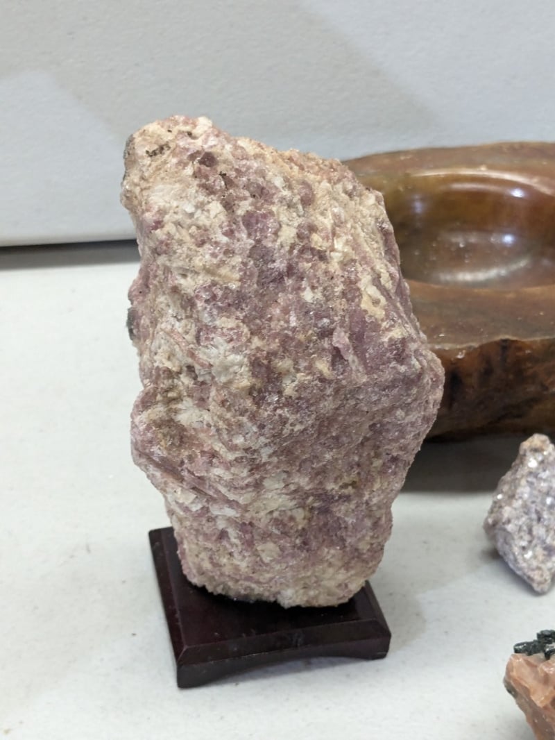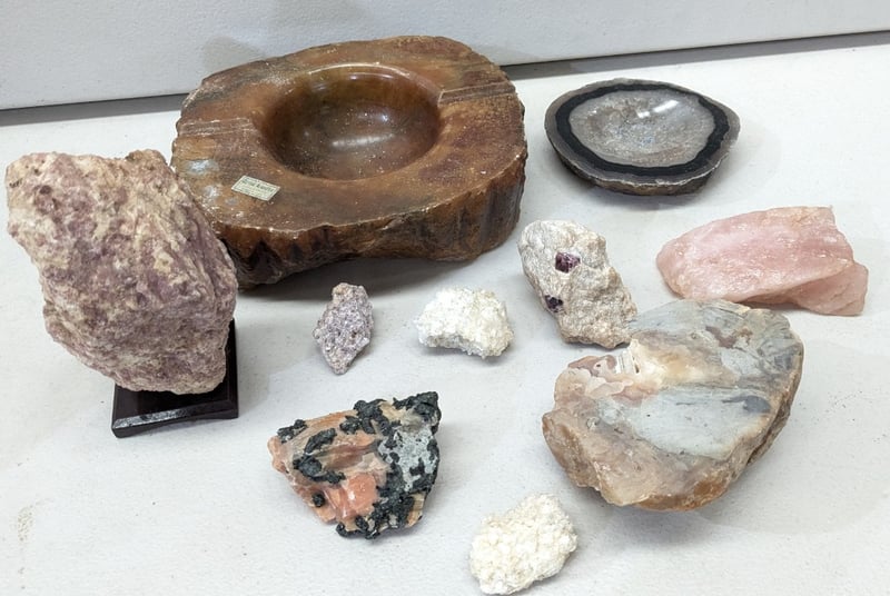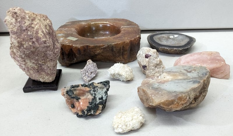 COLLECTION OF MINERALS AND GEOLOGICAL SPECIMENS A Comprehensive Museum-Quality Collection Mineral Specimens Including Lepidolite, Tourmaline, Rose Quartz, And Genuine Alabaster, Alongside Crystalline Formations And Geode Sections. Condition: Good - Refer To Images 584584+12