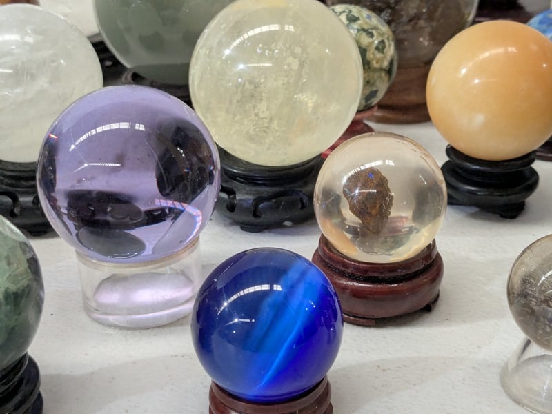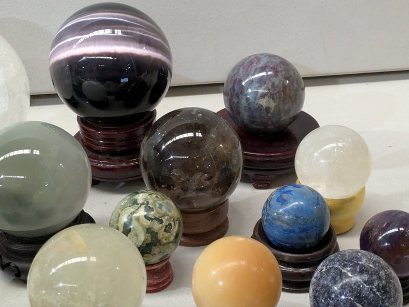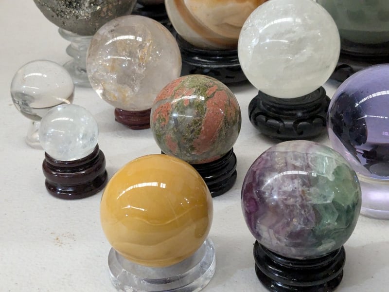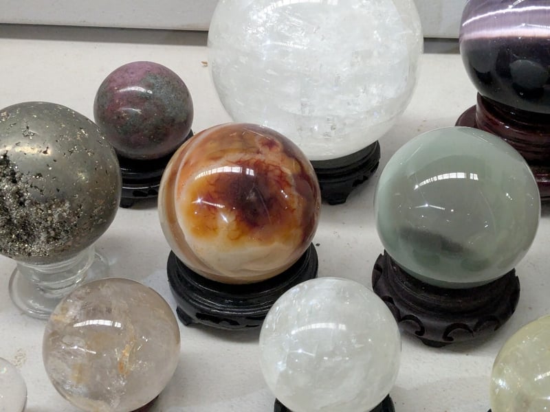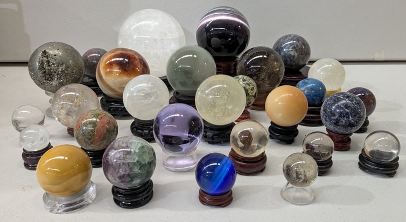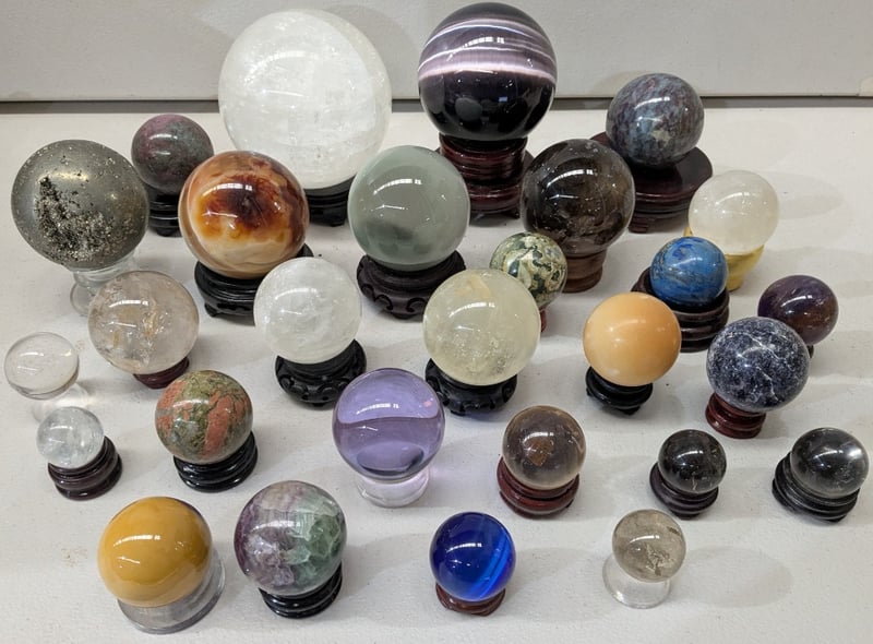 Comprehensive Collection Of Approximately 30 Polished Mineral Spheres In Varying Sizes And Stone Types, Including Clear Quartz, Amethyst, Fluorite, Jade, Sodalite, Unakite, Pyrite, Labradorite, And Other Semi-Precious Stones