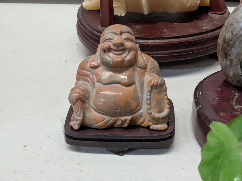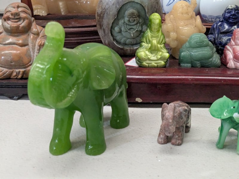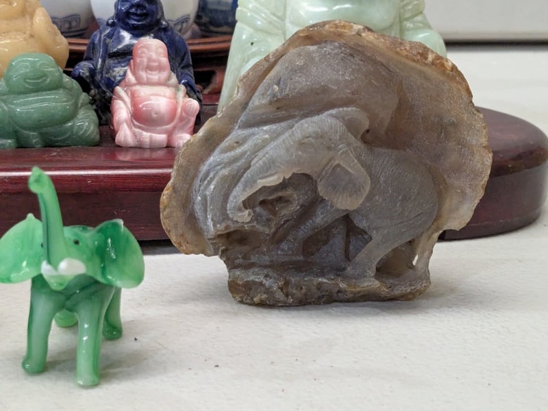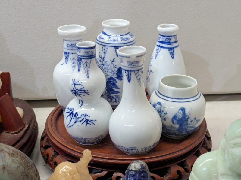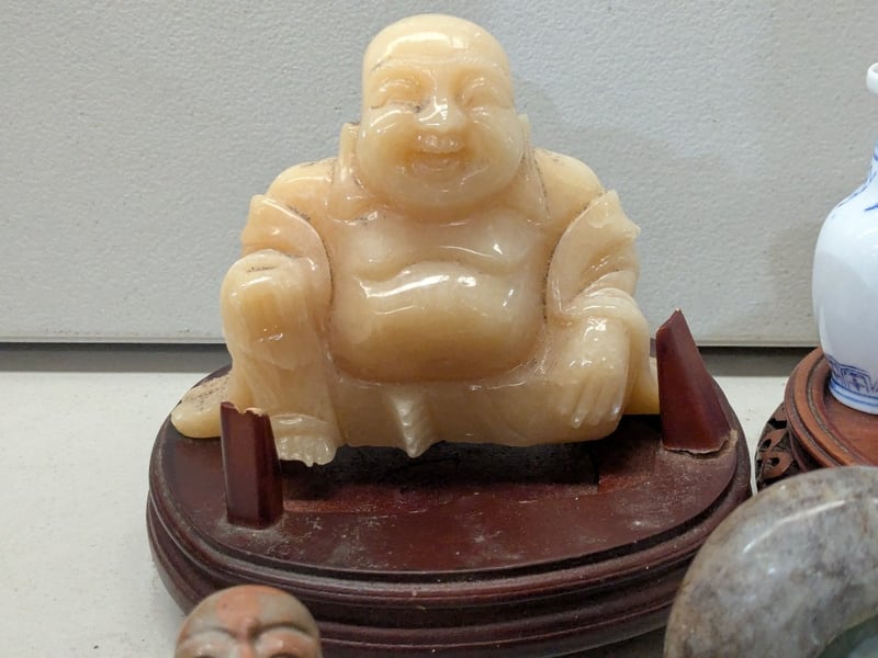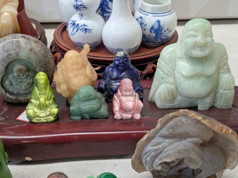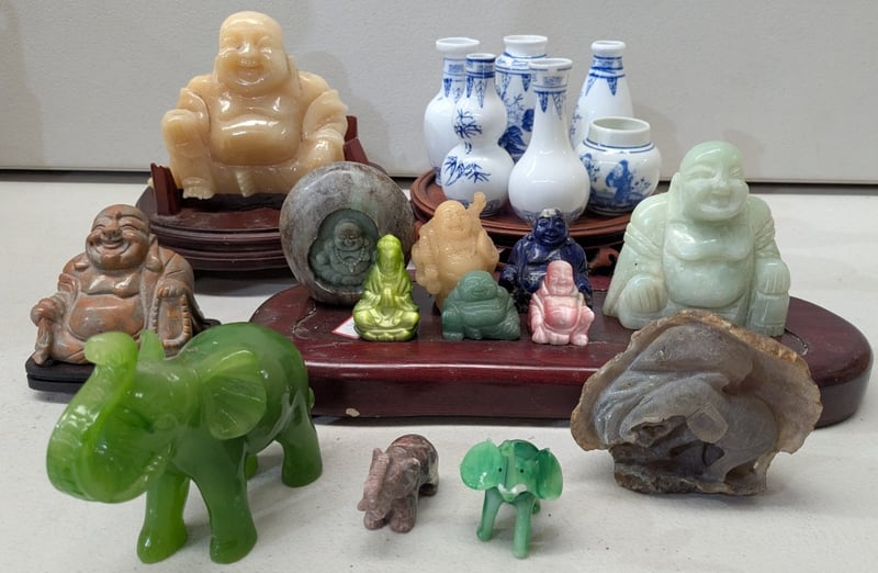 ASIAN JADE AND STONE CARVED BUDDHA FIGURINES COLLECTION WITH BLUE AND WHITE PORCELAIN VESSELS